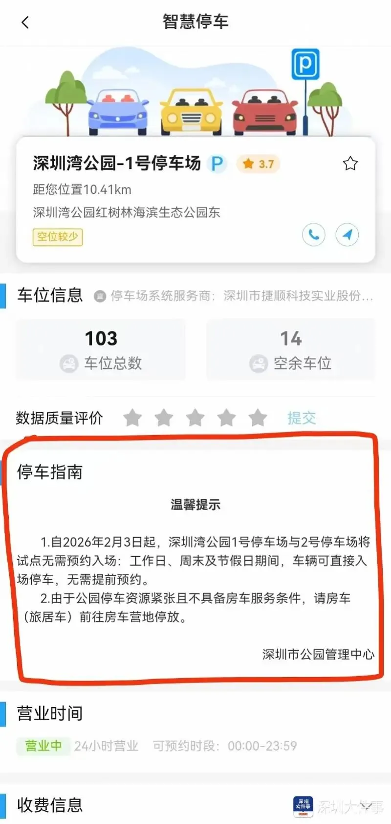 近日,深圳市公园管理中心发布公告,根据公告,自2026年2月3日起,深圳湾公园1号停车场与2号停车场将试点无需预约入场。工作日、周末及节假日期间,车辆可直接入场停车,无需提前预约。