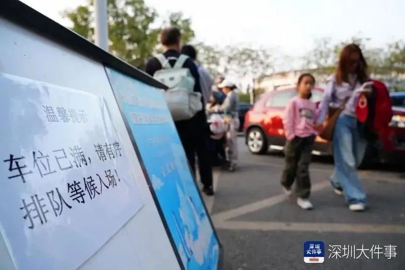 ▲深圳湾公园2号停车场入口用A4纸打印温馨提示:请有序排队等候入场,此前放置的是预约停车的指示。