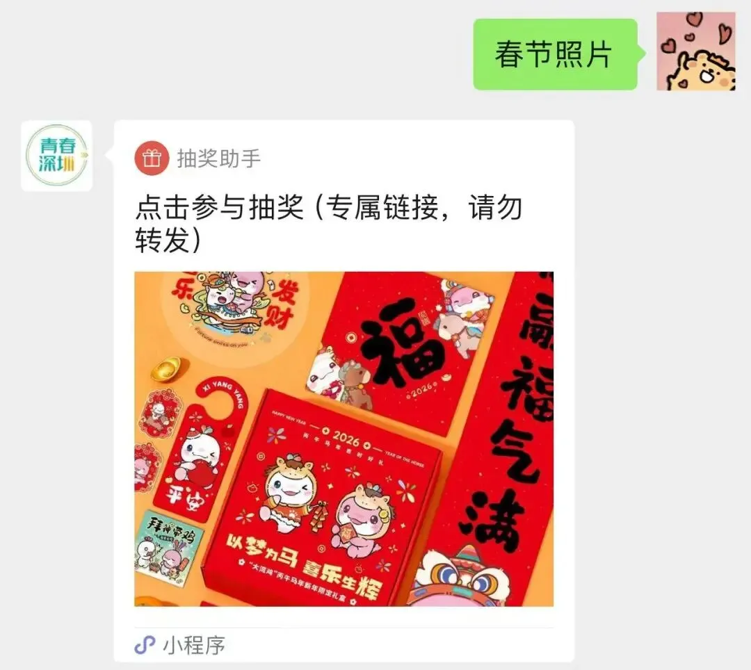在“青春深圳”微信公众号对话框,回复关键词:【春节照片】即可参与抽奖活动。