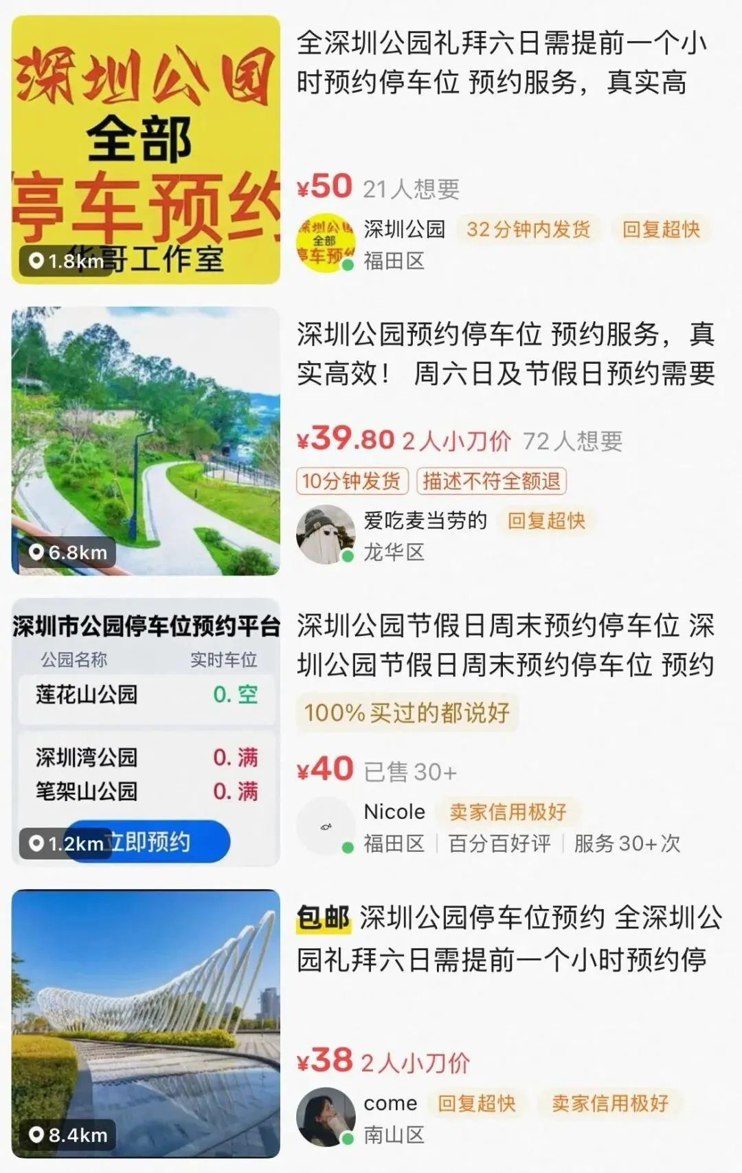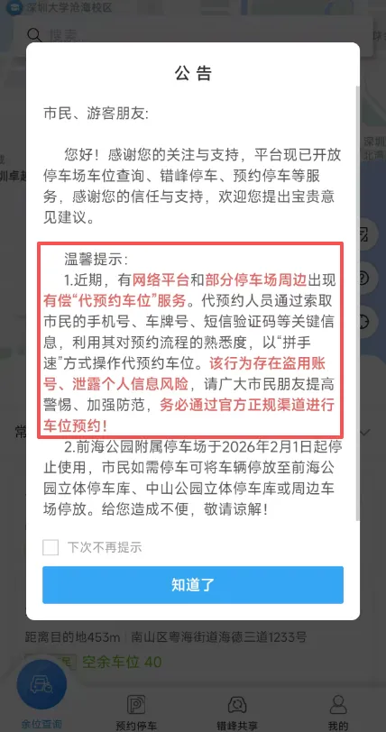 这一调整意味着, 深圳湾公园部分停车场 将告别2023年以来推行的预约停车模式, 回归到更传统的现场管理方式。 02 此次调整的直接原因, 正是黄牛有偿代预约服务的泛滥。 深圳湾公园管理方工作人员坦言, 此前大量黄牛抢占预约名额, 导致普通市民通过正规渠道难以约到车位, 相关投诉居高不下, 这也是推出试点取消预约举措的核心初衷, 这一说法也在"i深圳"智慧停车页面的 多处公告中得到印证。