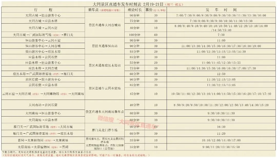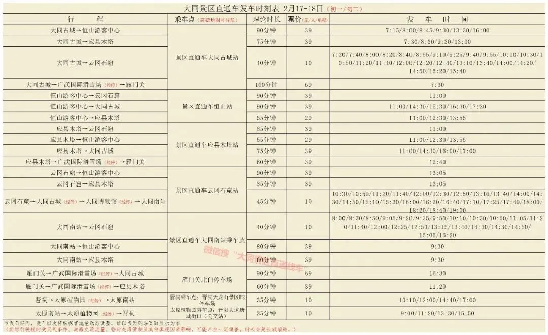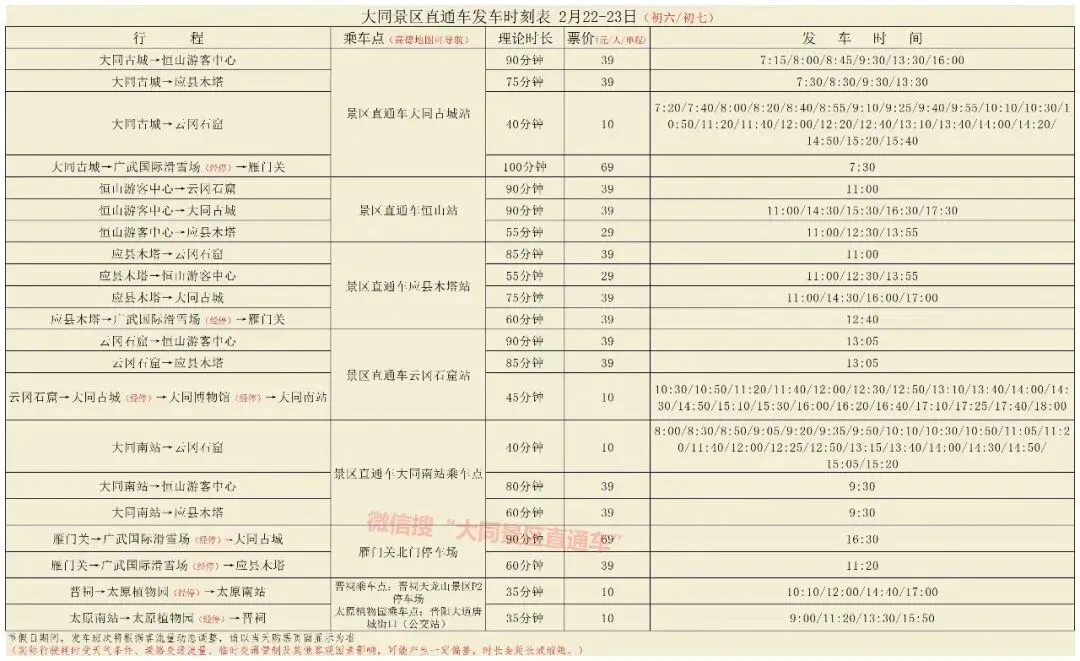 春节假期,发车班次会根据客流量灵活调整,最新时刻表可在 “晋游宝景区直通车” 小程序首页实时查询。