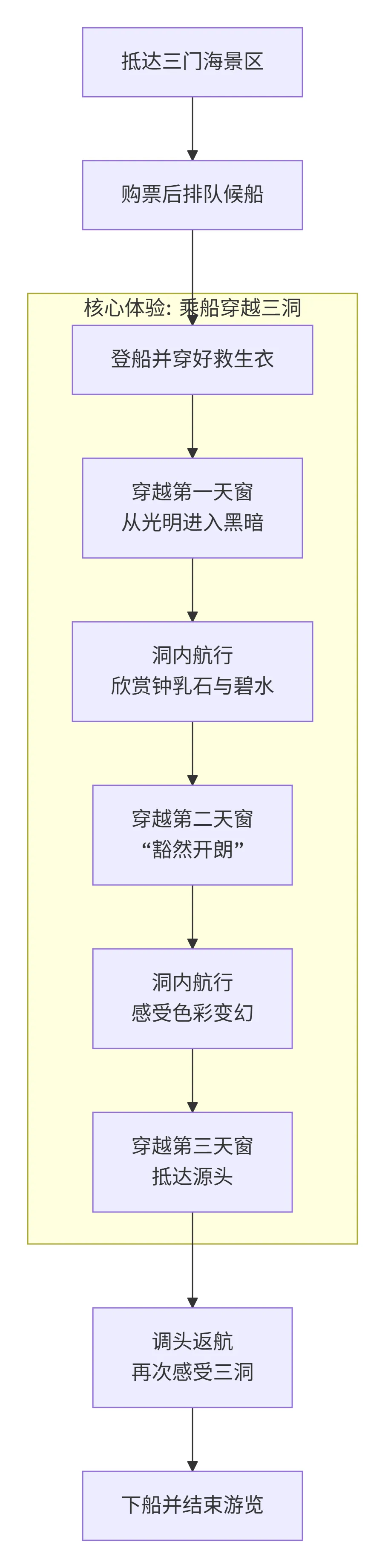 下图清晰地展示三门海乘船游览的完整流程与核心体验: