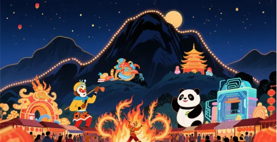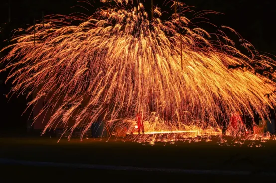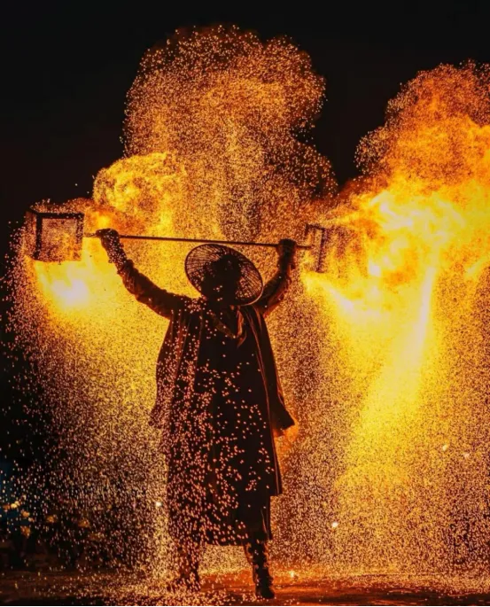 火舞者手持火刀、火棍,在夜色中划出炽热的轨迹;高空杂技演员在灯光下翻转腾挪;更有非遗打铁花在夜空绽放——千万朵铁花如流星般坠落,照亮人群中惊叹的脸庞,这一瞬间,“火舞不夜天”有了最生动的注脚。