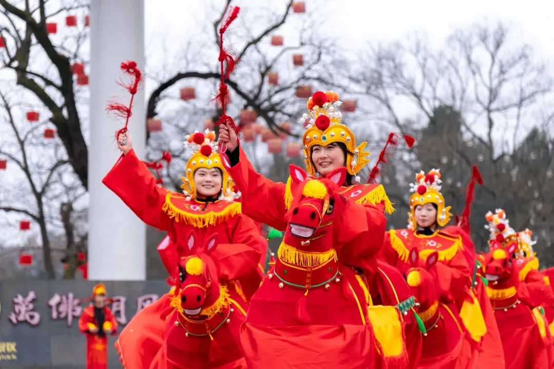 玩法:16匹竹篾布马花式走位,“抖鞭走马”、“跳转身”、“扬鞭跑马”、“长蛇开阵”等复杂队形变换齐上阵,一路互动送福,路过的人都狠狠沾上喜气!