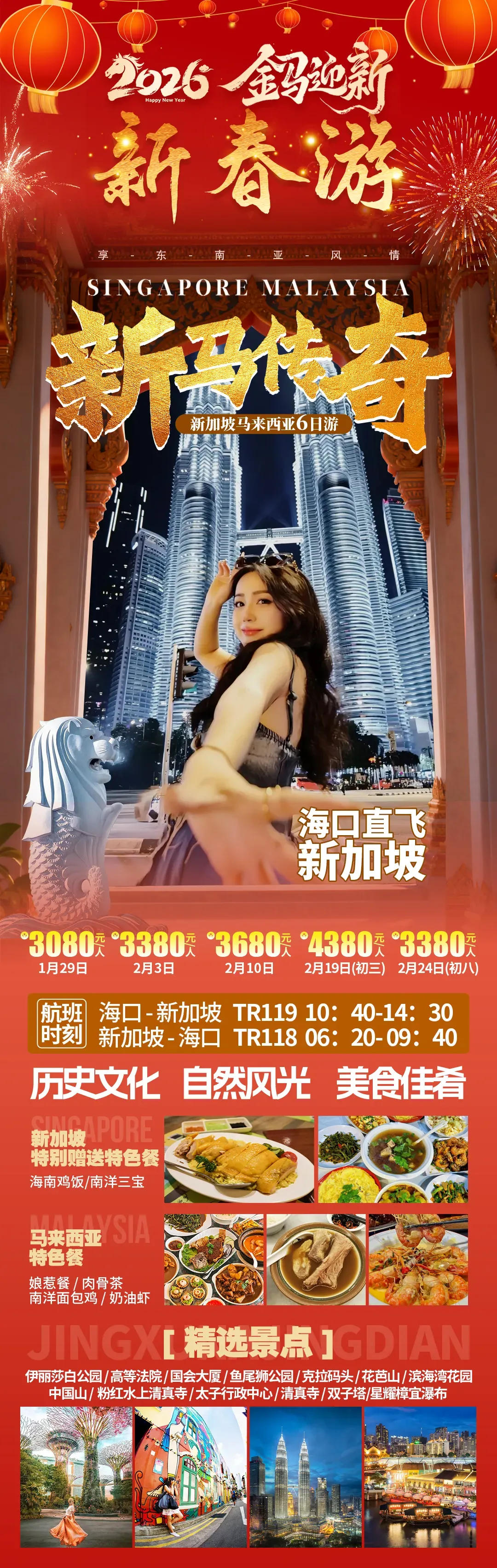 春节旅游去哪儿?│2026年春节,不必局限于熟悉的年味.从海南直飞新马,让红灯笼下的团圆更有新意,让多元文化的魅力温暖旅途!