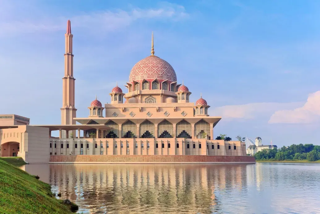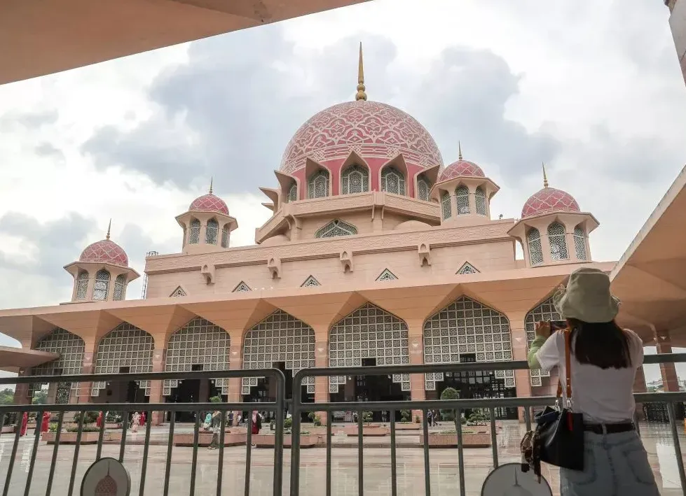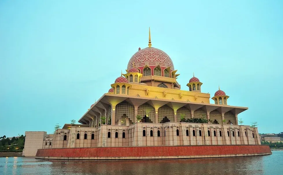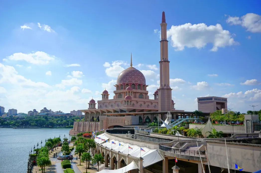 粉红清真寺(Masjid Putra) 是东南亚地区最大的水上清真寺 清真寺主体建筑有四分之三建在水上 外观粉红色因此又称“水上粉红清真寺”