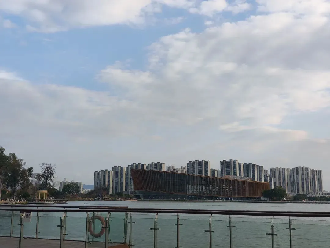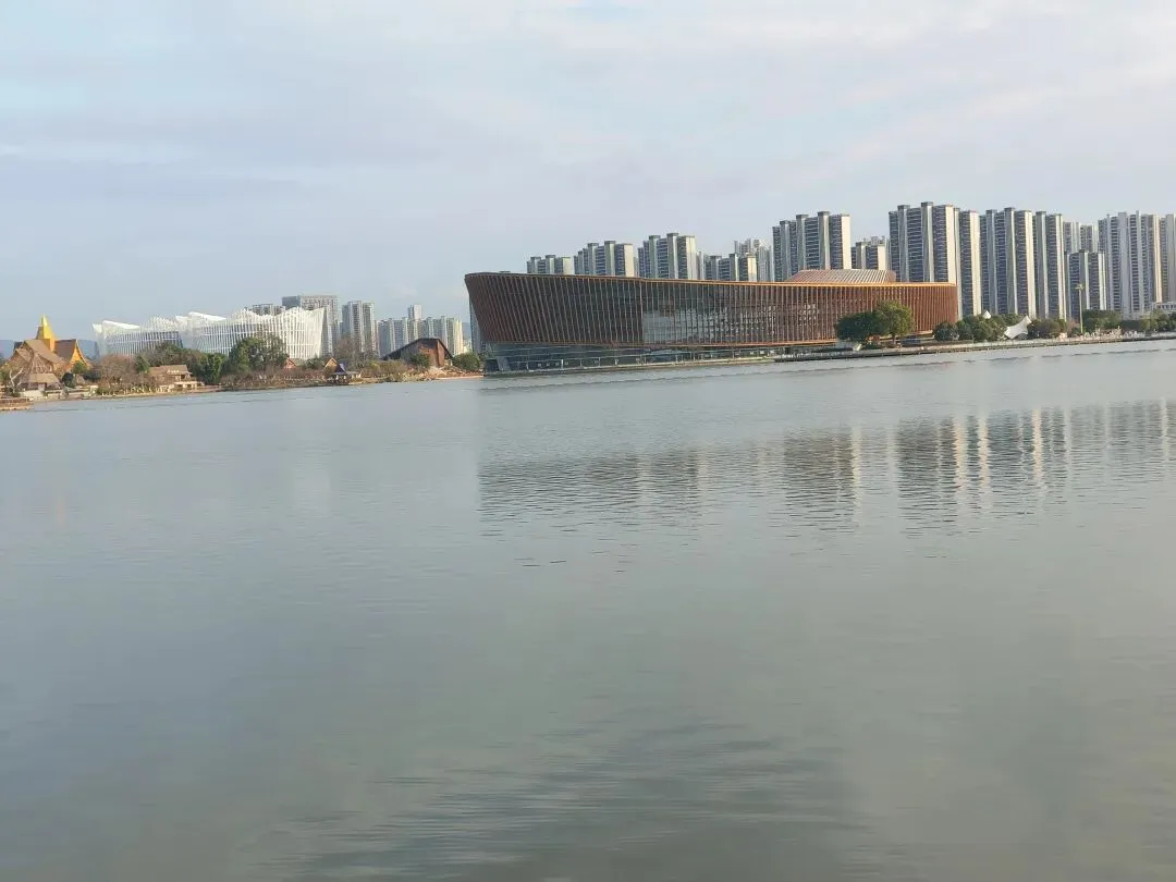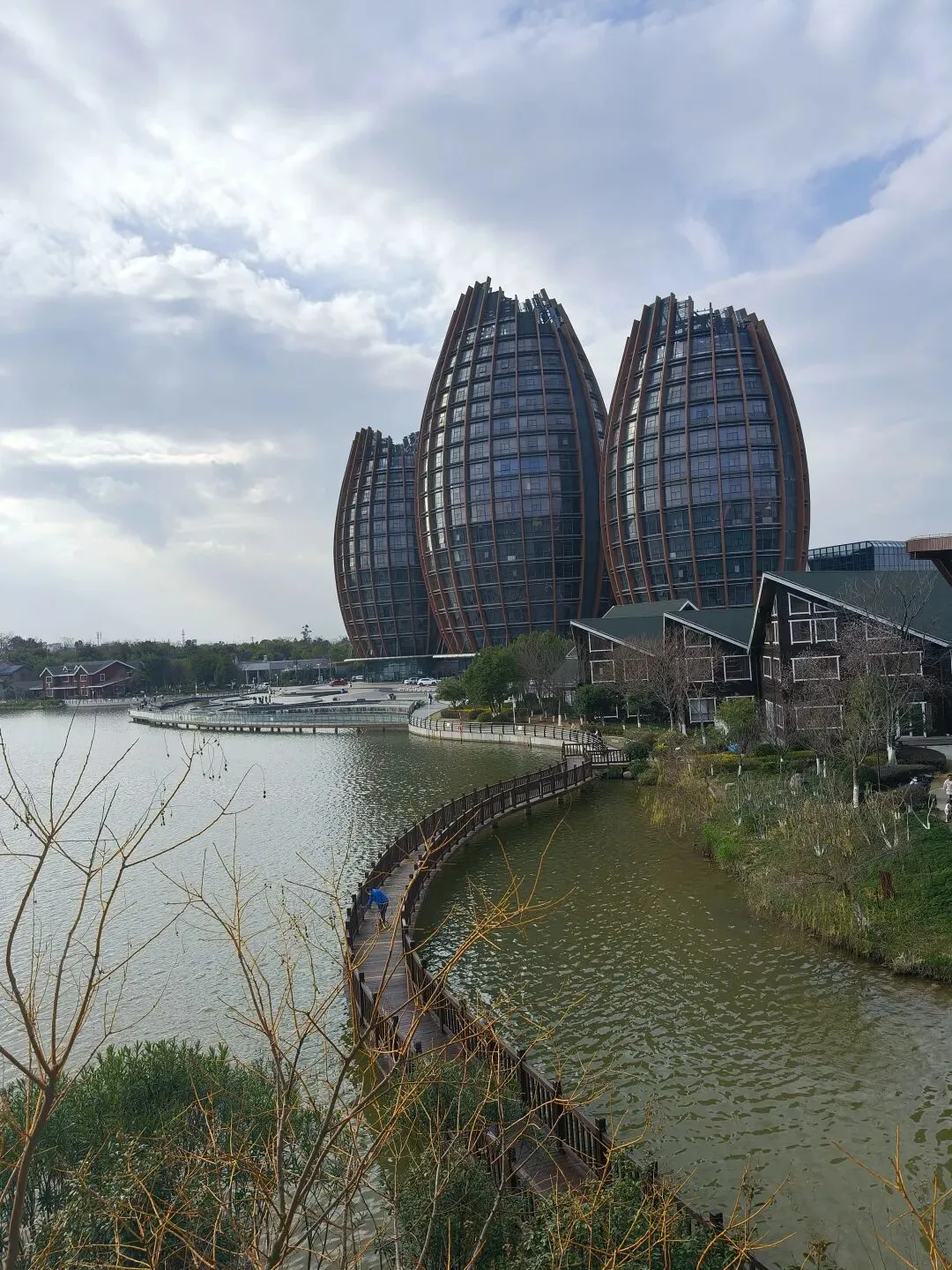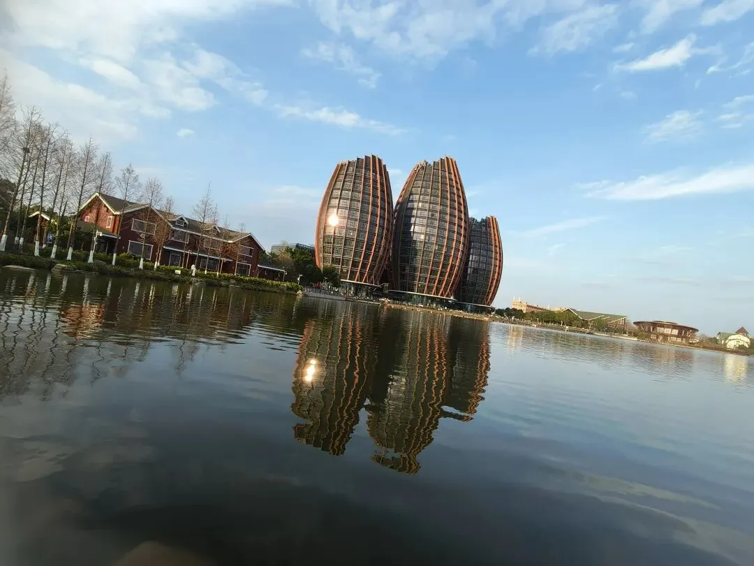 湖边这三大椭圆形的酒店在蓝天白云、晴空万里的映衬下,在湖水的倒映下,显现出一幅美丽的画卷。