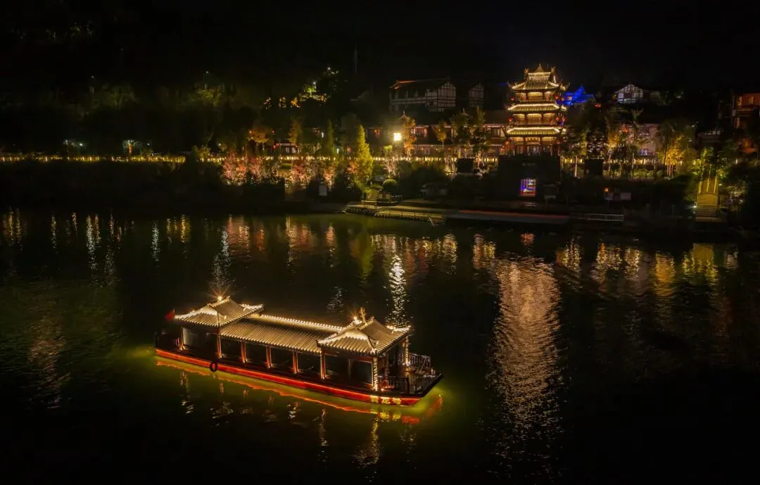 游船四周点缀的灯光与江景交相辉映