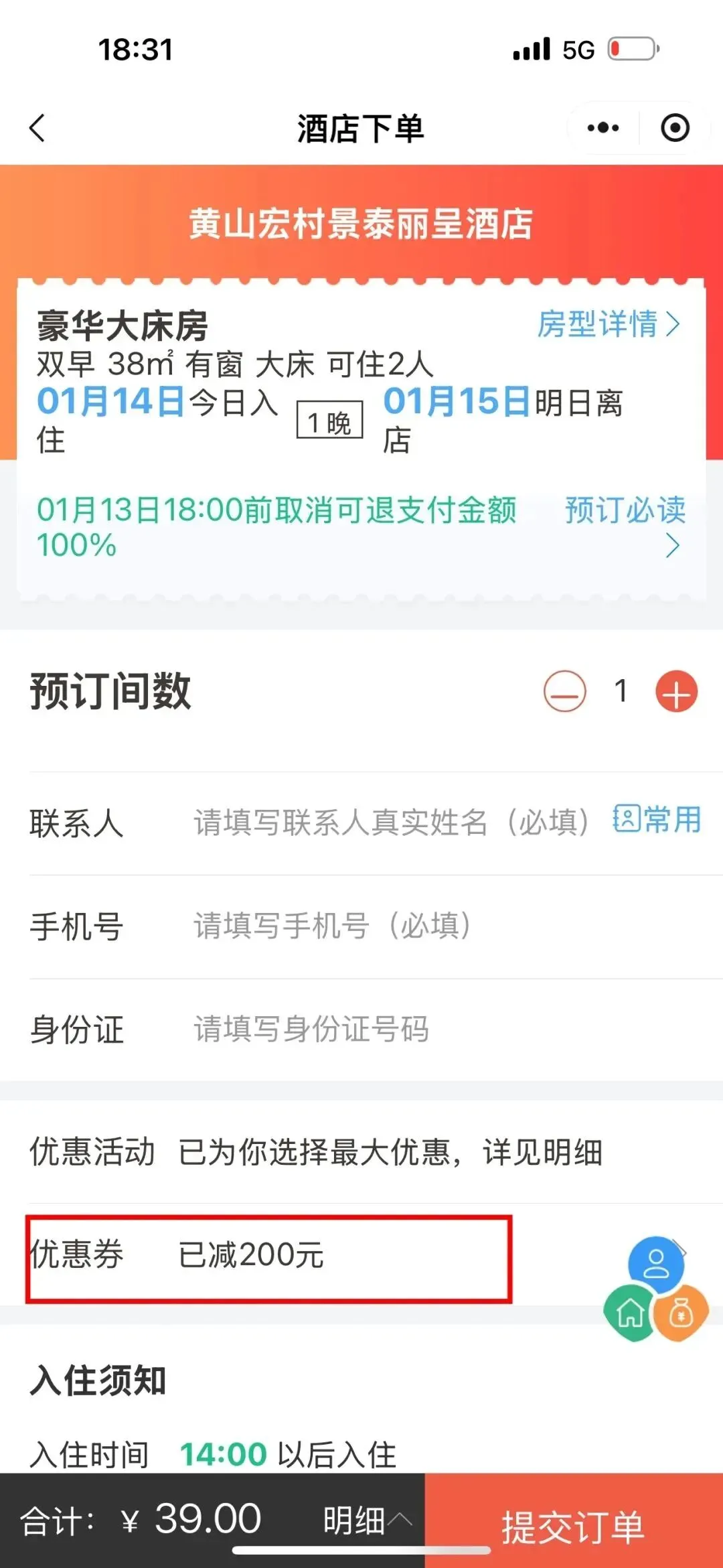 🏨住宿场景:预订黄山南大门如家商旅酒店(高级大床房参考价229元),用券后实付29元。