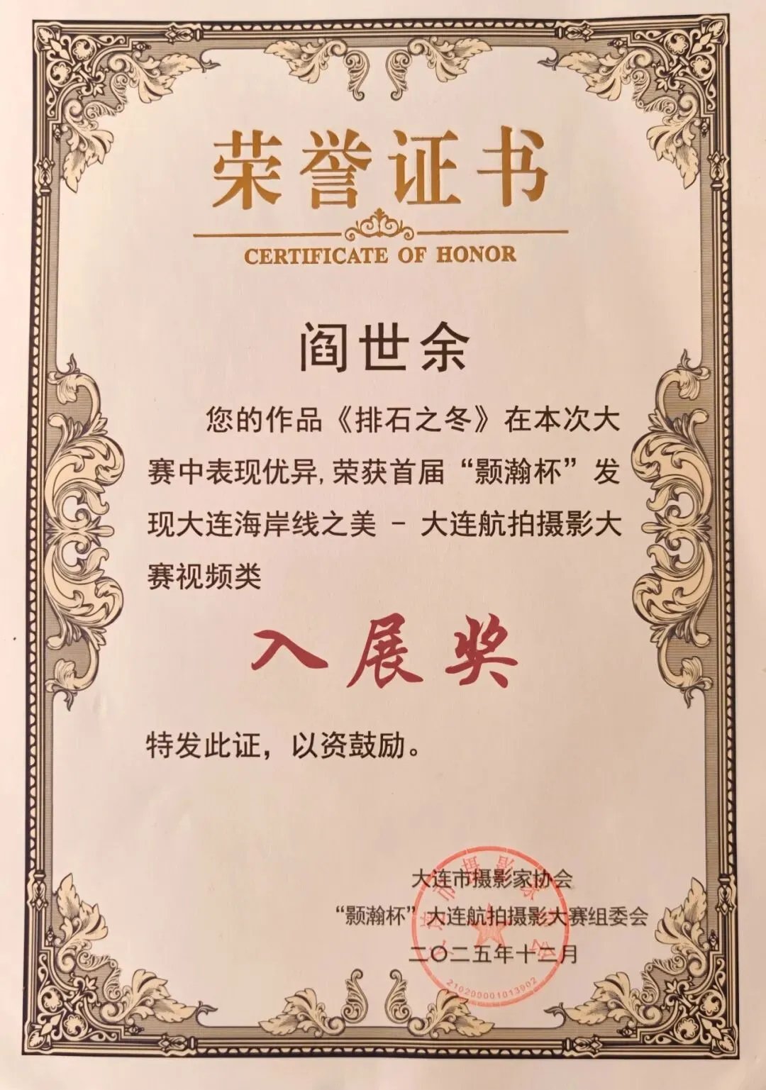 《排石之冬》在大连市摄影家协会举办的首届“颢翰杯”发现大连海岸线之美——大连航拍摄影大赛中,获得视频类入展奖。
