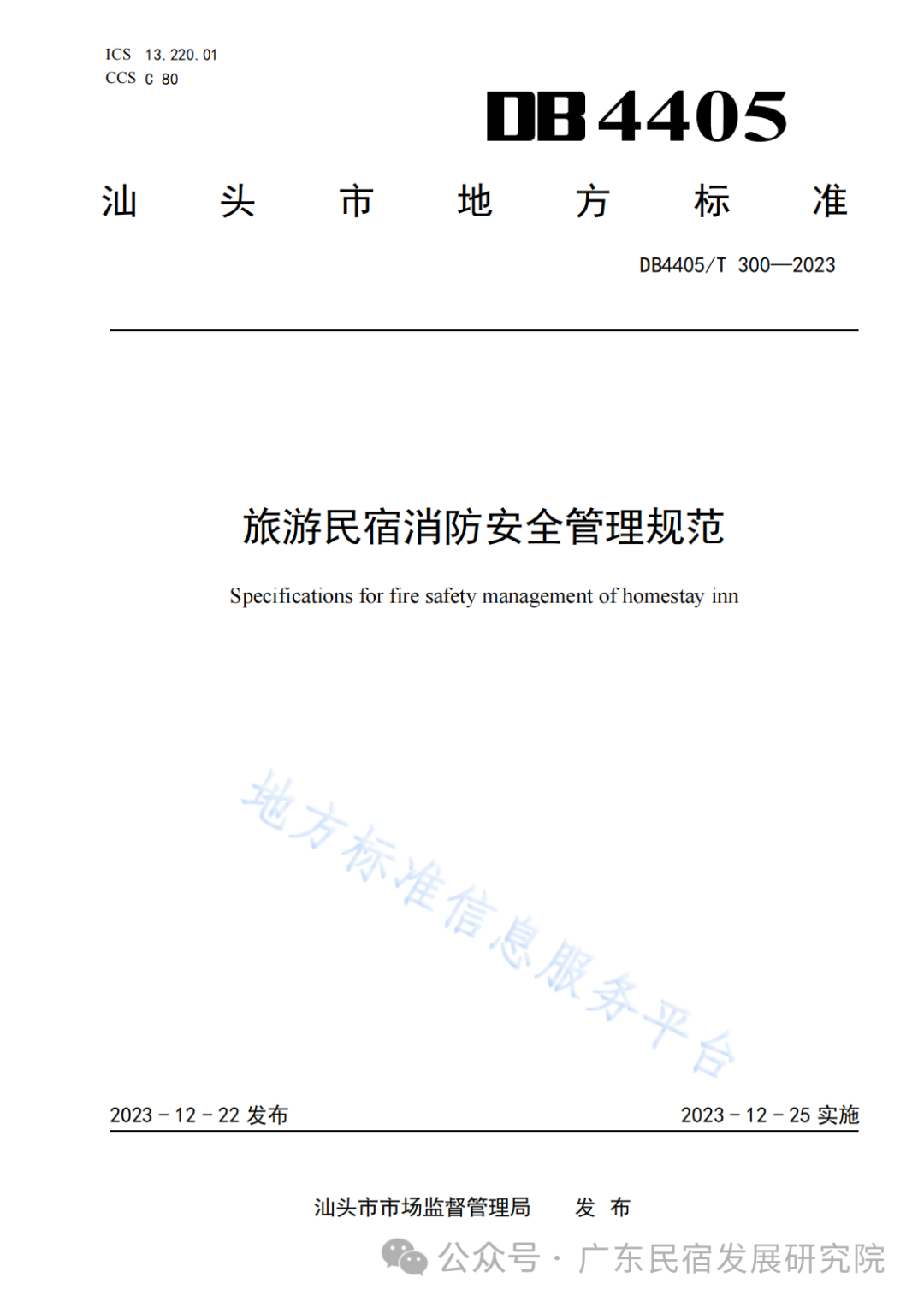 粤宿规范·汕头丨汕头市地方标准《旅游民宿消防安全管理规范》:适用利用自建住宅改造的旅游民宿消防安全管理,消防安全标准化创建、评审