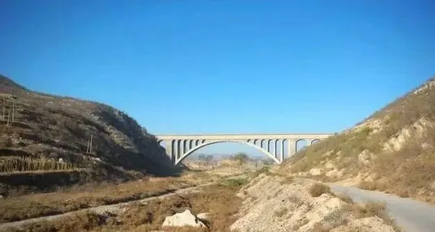 这里是跃峰洞出口,其上口约宽150米,跨沟部分99米,需要浇筑一个渡槽跨过郊口和辉水之间的旱河沟,这项工程称之为“飞跃渡槽”。渡槽于1975年7月动工,1976年7月竣工。全长154米,高23米,宽7.8米,主跨100米,圈厚2米,用4层细料石砌成。两肩18个小拱圈呈半圆拱形,跨径4米,拱厚0.45米,全用青石砌成,坚固美观,经久耐用。该渡槽砌石部分由磁县民工一团陶泉民工营施工,钢筋混凝土部分由邯郸地区水利工程处施工。