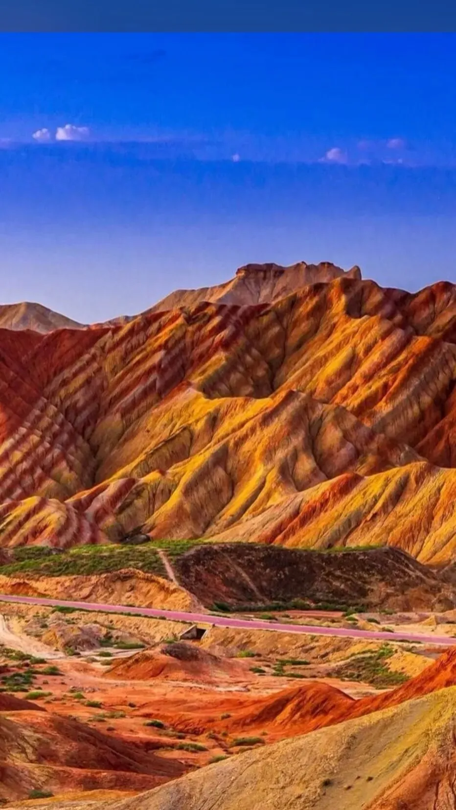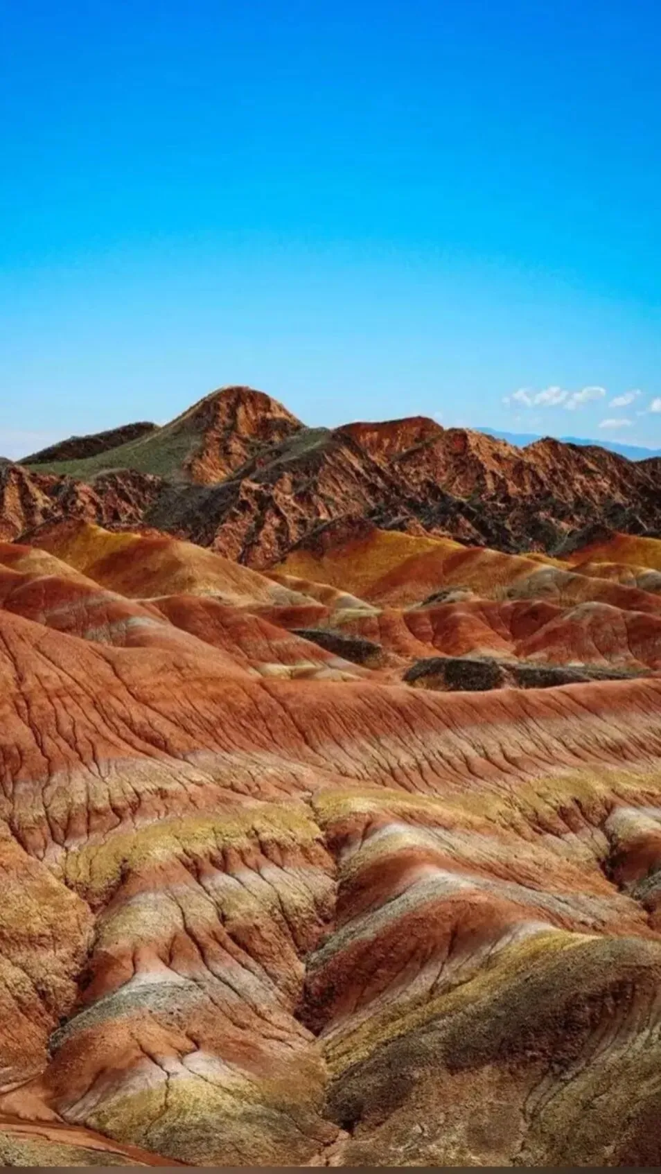这片奇观的诞生,源于1.35亿至6500万年前的白垩纪红层。历经亿万年地壳抬升、流水切割与风力侵蚀,不同矿物质沉积形成的岩层,呈现出红、橙、黄、绿、蓝、灰、白的斑斓色带,有的顺山势呈波浪起伏,有的斜插山根如彩绸斜铺,构成“大扇贝”“神龟问天”“众僧拜佛”等栩栩如生的造型。雨后初晴或日落时分,阳光为彩丘镀上金辉,色彩饱和度飙升,光影流转间宛如流动的油画,是摄影师眼中的天堂。