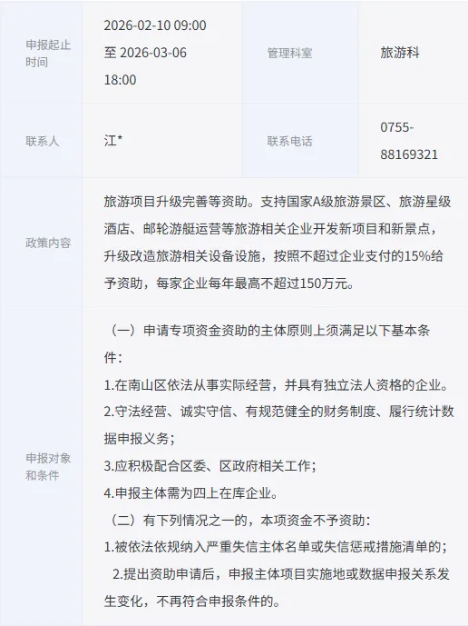 支持国家A级旅游景区、邮轮游艇运营等旅游相关企业开发新项目和新景点,升级改造景区旅游设备设施、购买邮轮游艇或游船设备,完善旅游购物、旅游厕所等配套设施,发展旅游在线服务、智慧旅游等旅游信息化项目,按照不超过企业支付的15%给予资助。每家企业每年可申报一次,每家企业每年最高不超过150万元。申请项目限上一年度竣工且实施地在南山区,合同数不超过10个,投入时间不超过上两年度,投入额不低于50万元。