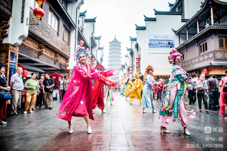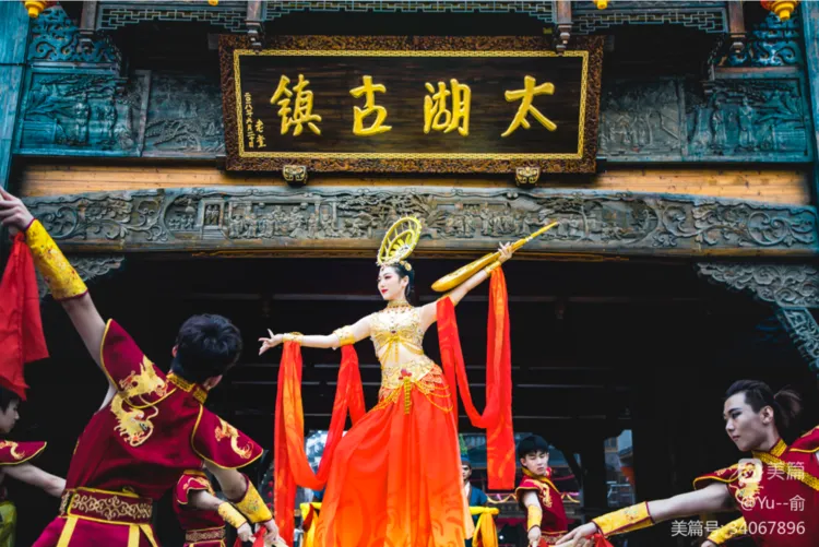 鼓乐迎宾队列中央更有衣袂飘飘的舞者,在鼓上蹁跹起舞,太湖古镇喜迎八方来客,给人宾至如归的感觉。