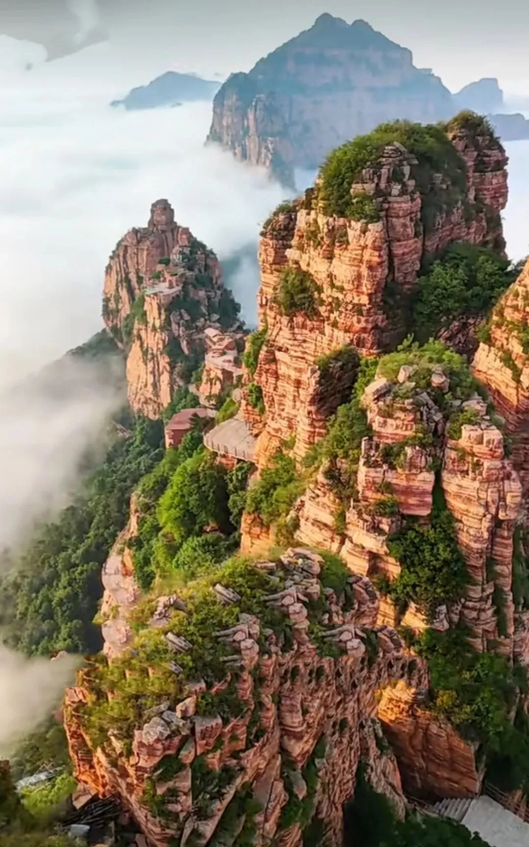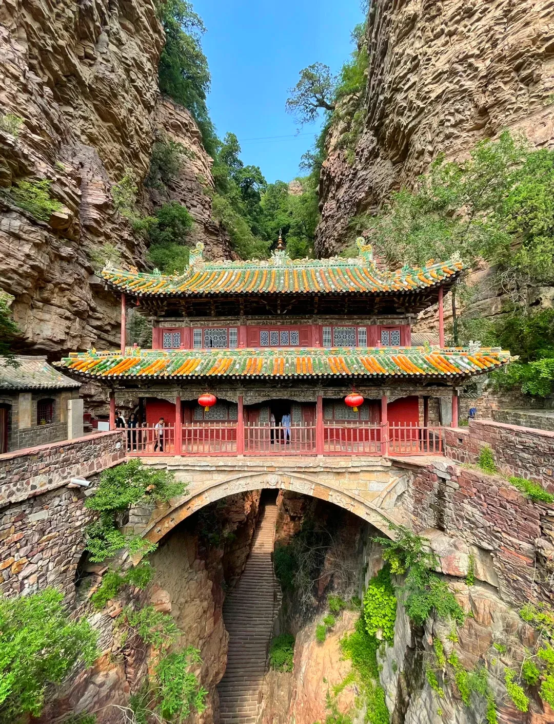 苍岩山风景区:位于井陉县,距市区约70千米,《卧虎藏龙》取景地。历史价值:国家4A景区,福庆寺为重点国保,隋代起为佛教圣地,桥楼殿是全国三大悬空寺之一。名人古籍:李白、王维游历题诗,袁宏道、王世贞盛赞其奇秀,《井陉县志》详载其风貌。切身感受:林木葱郁、溪水潺潺,桥楼殿悬于绝壁惊险震撼,丹霞奇峰配翠植,古寺梵音伴山水,夏日避暑绝佳🌿