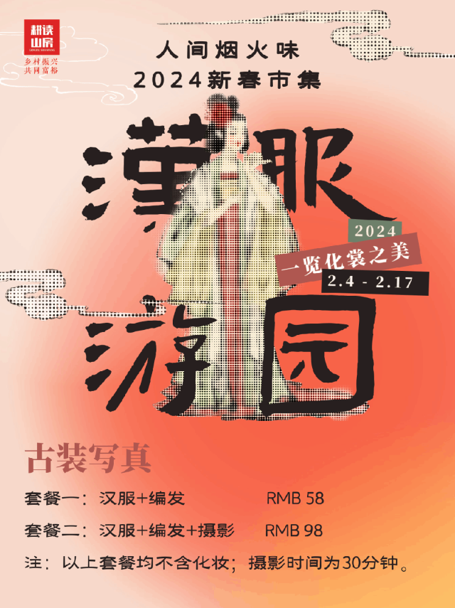 2024新春市集,耕读山房重磅推出了汉服旅拍写真套餐,包含汉服、编发、摄影等等,身着一袭汉服,和我们一起游园、逛逛市集,梦回大宋,享受轻松自由、放空的古代生活