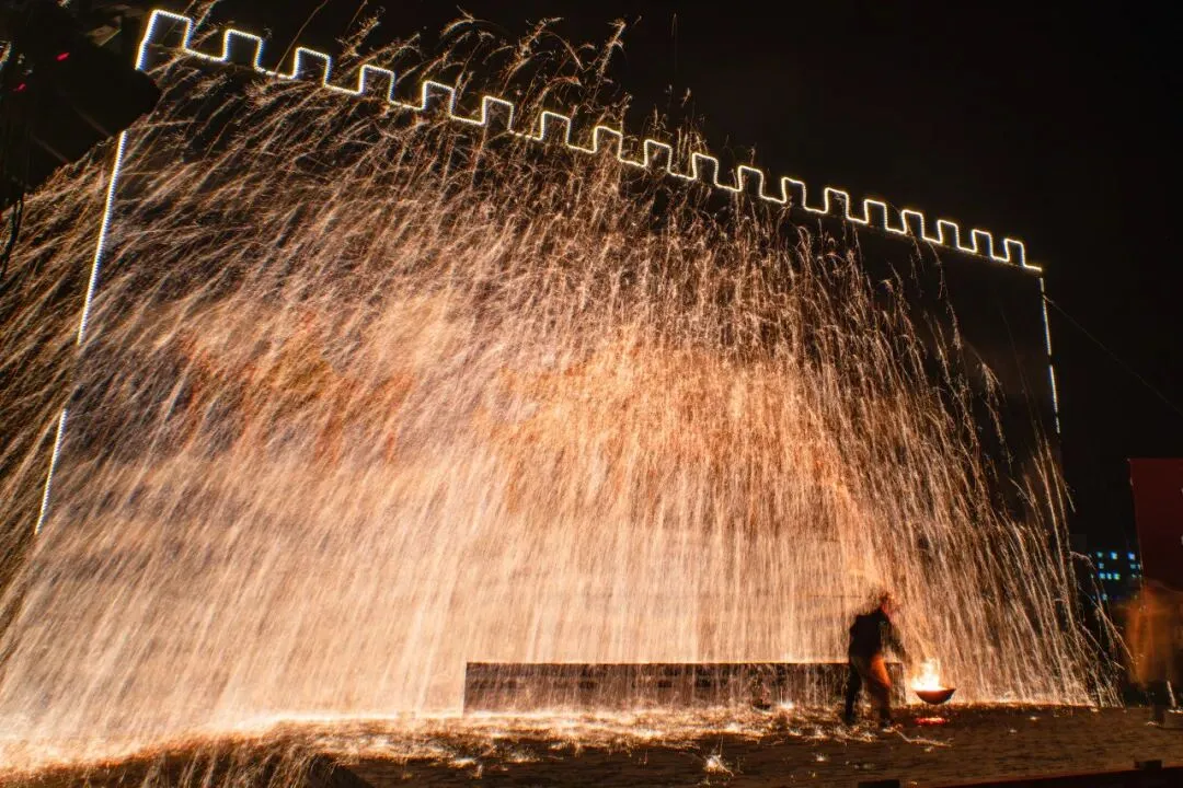 相传打树花是因为 当年烟花是富人才买得起 穷人也想放烟花热闹一下 于是就从打铁时四溅的火花中 得到灵感 把熔化的铁水 泼洒到古堡城门上方的砖墙上 没想到效果比烟花还好