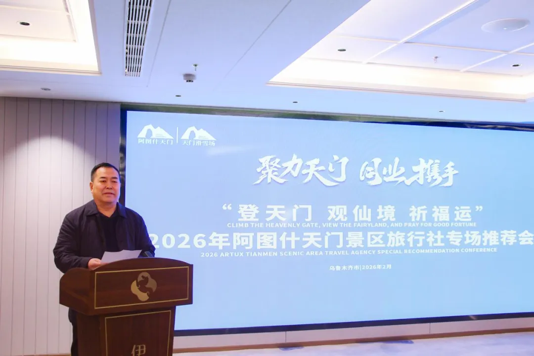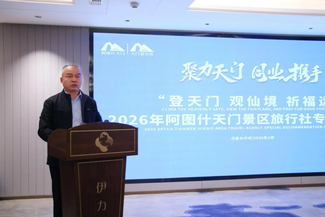 2026年2月5日,由阿图什天门景区主办,新疆旅游服务商会支持的“聚力天门・同业携手——登天门、观仙境、祈福运”阿图什天门景区旅行社专场推介会在乌鲁木齐成功举办。阿图什天门景区相关负责人、新疆旅游服务商会秘书长者学光、新疆原行网总经理谢佳燕及乌鲁木齐众多旅行社代表齐聚一堂,共探南疆文旅新机遇,共商产业合作新路径。