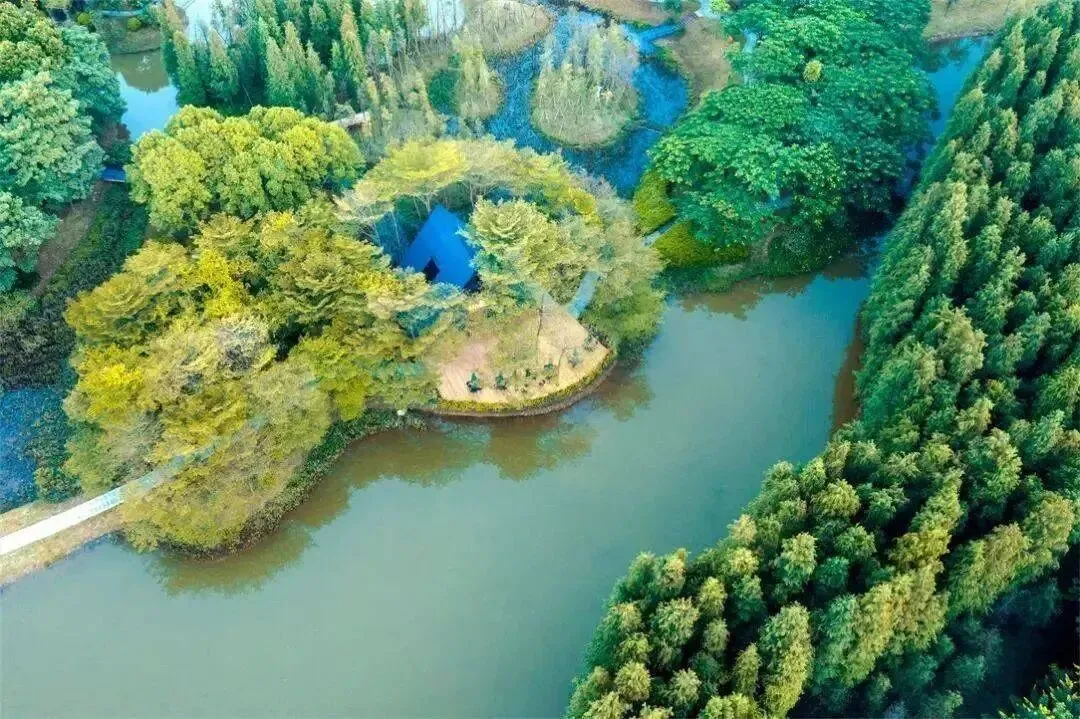 掩映在森林中,矗立在湿地岛水杉林湖畔