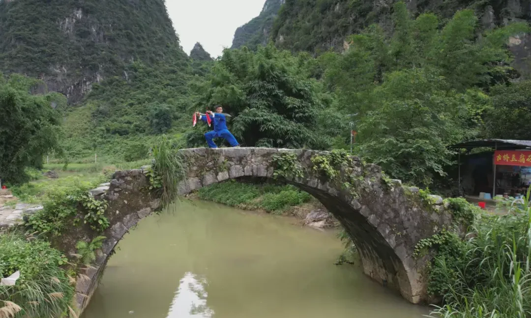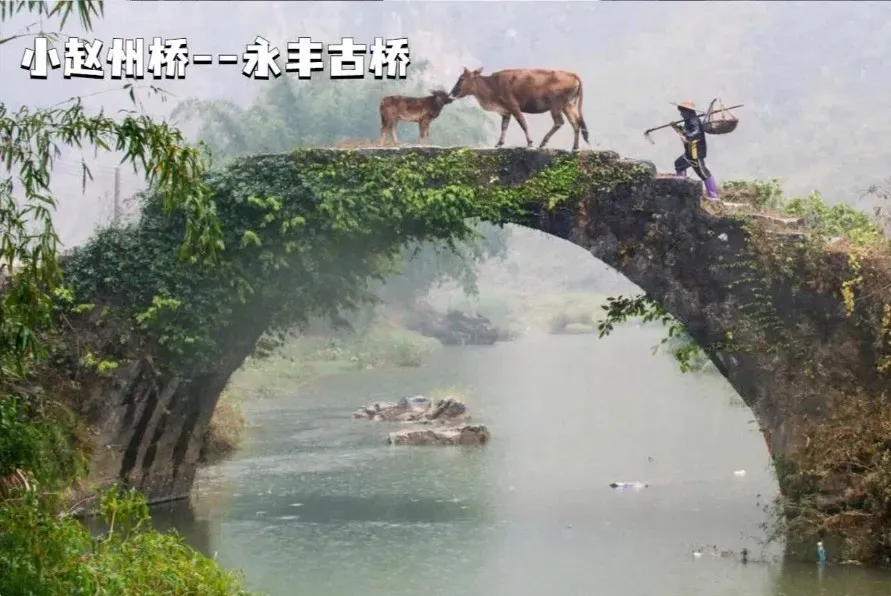 桥身毫无修饰,没有桥墩也没有栏杆,石桥两侧爬满了蔓藤植物,桥上与倒影以及远处的石山形成了一幅美丽的山水画,而桥面上的石板却是随着时光的流逝反而更加的格外的光滑。