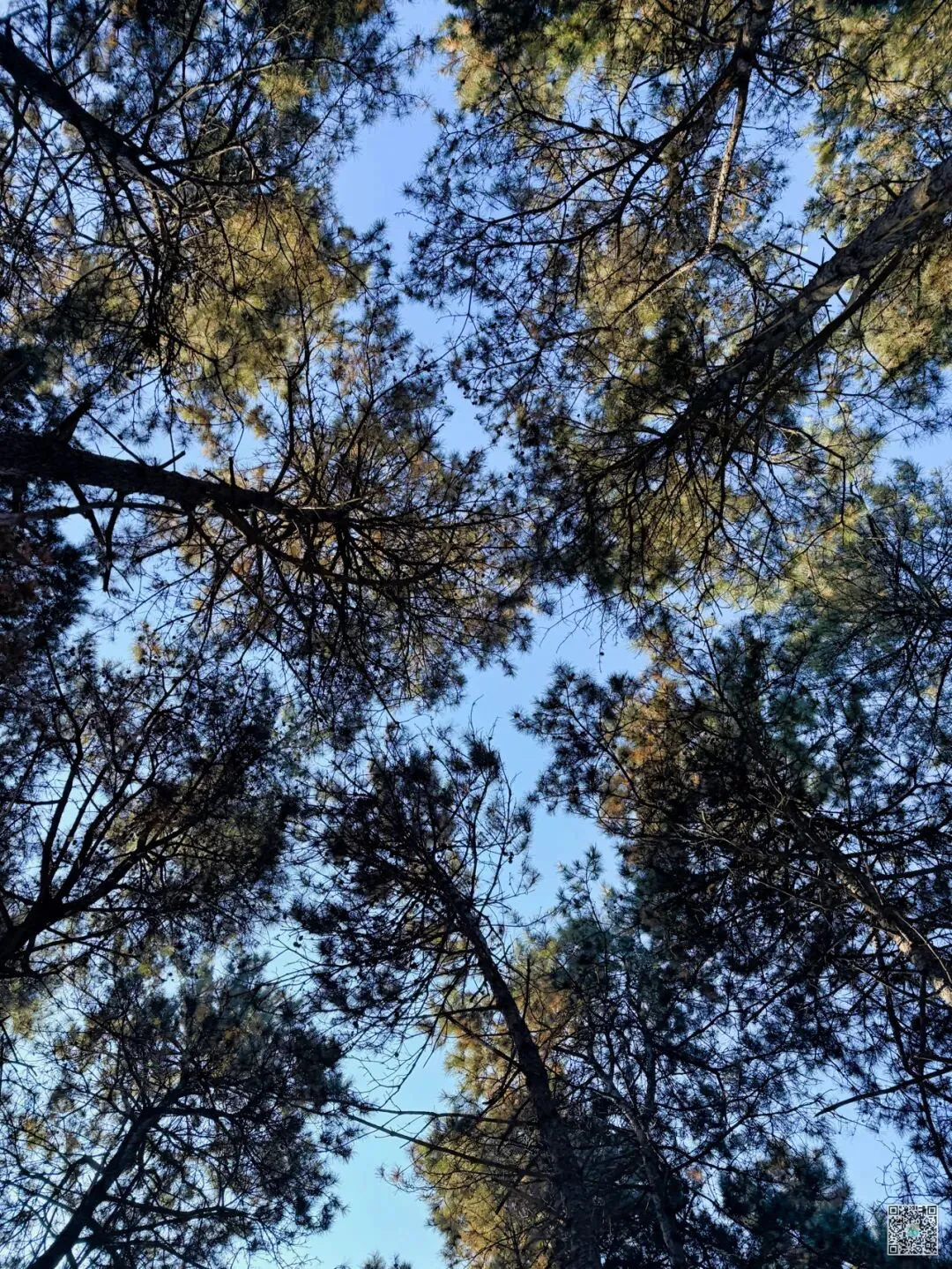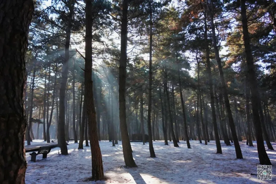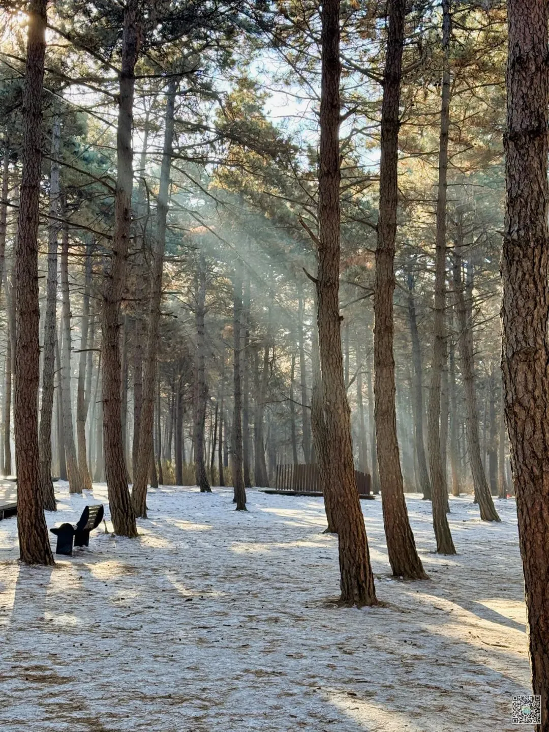 而后我们来到了黑松林站,在这里看到了阳光透过松林洒在大地上
