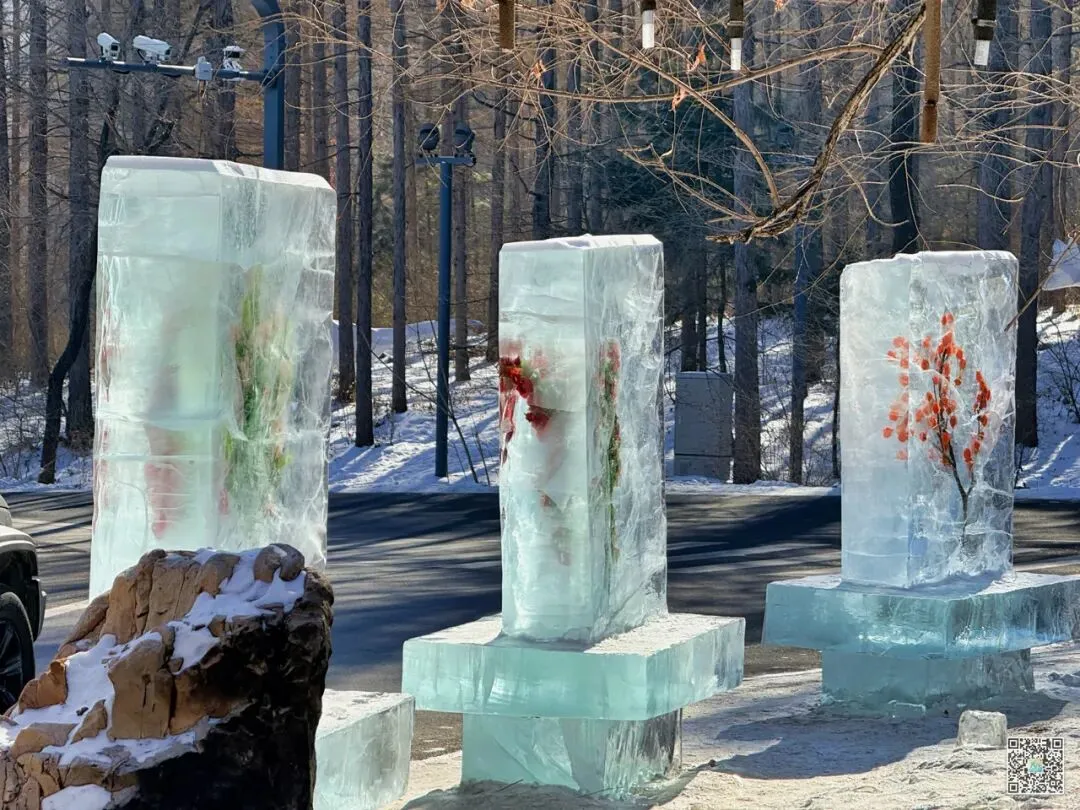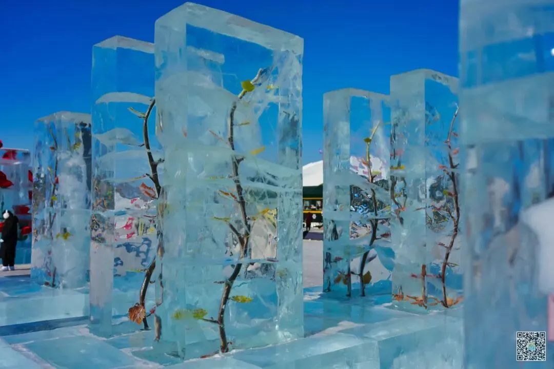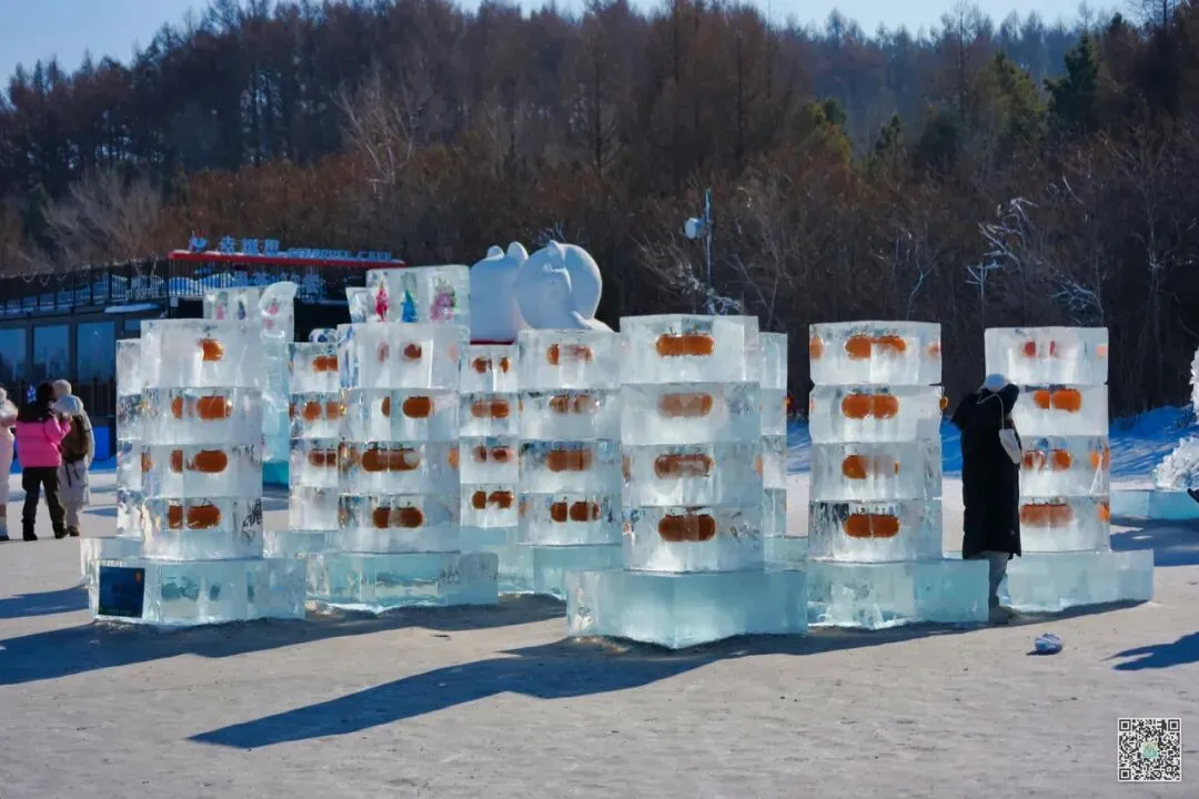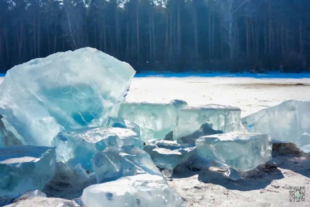 而后我们就来到了小森林浴场,这里的冰被用于冰雕造景,这里有很多取冰时留下的碎冰,冰是蓝色的,很漂亮