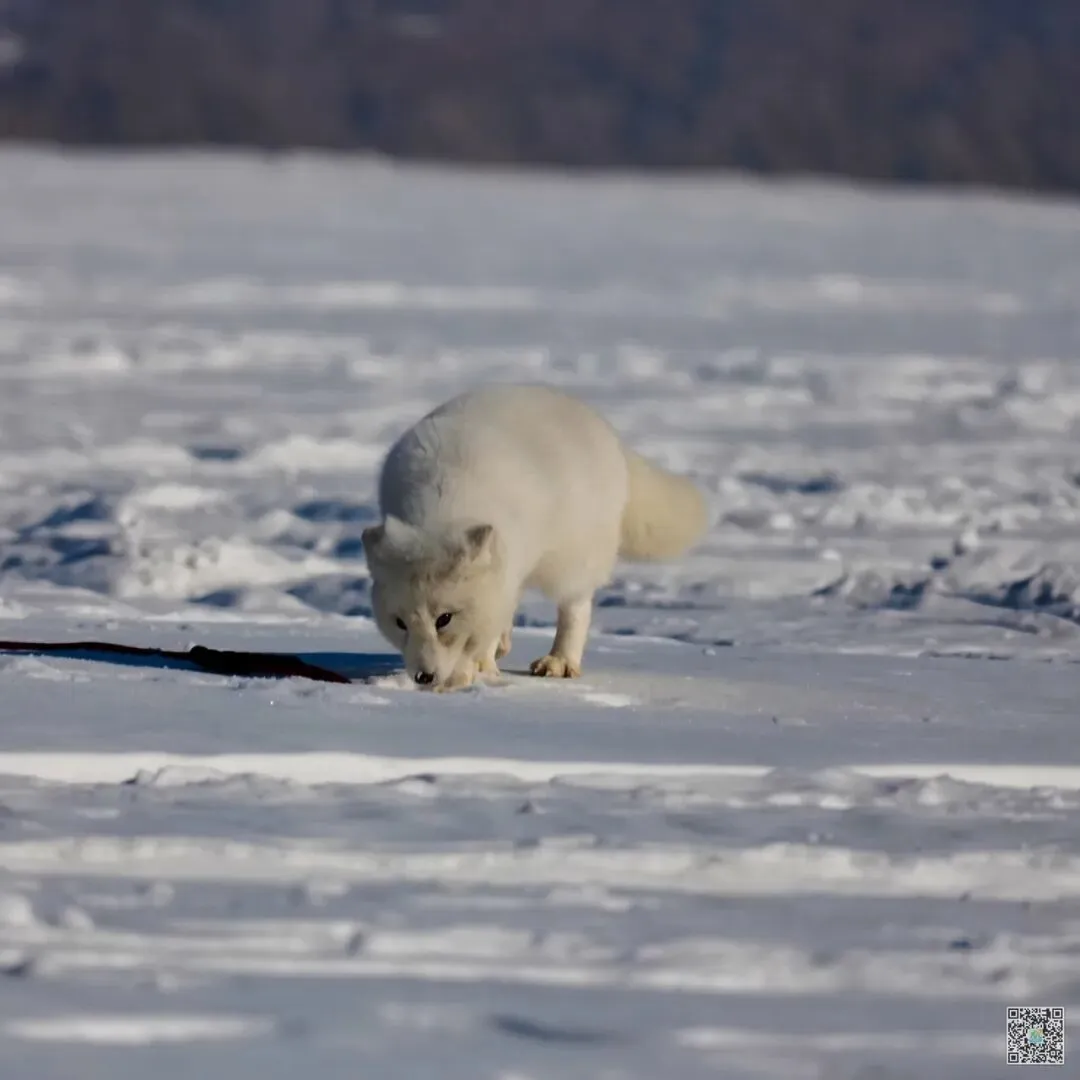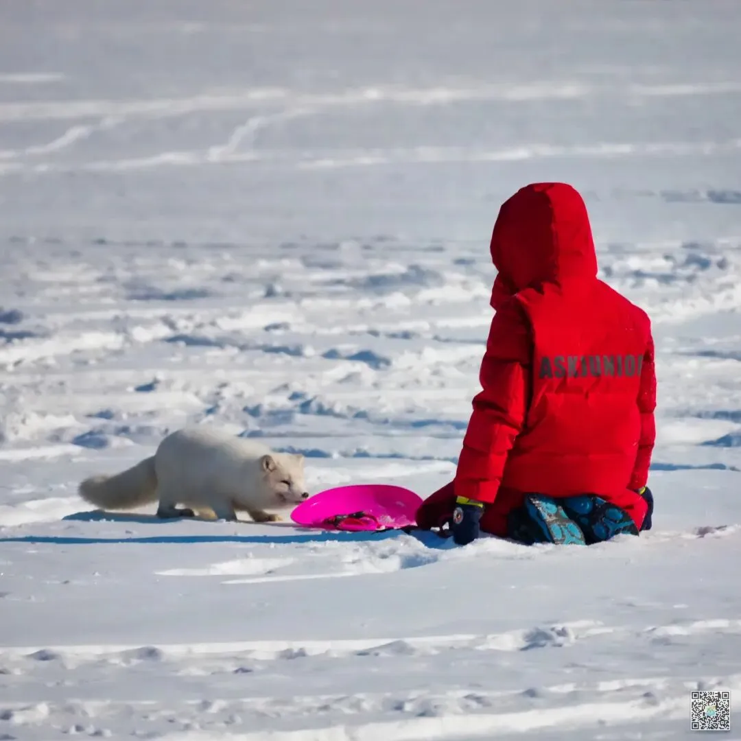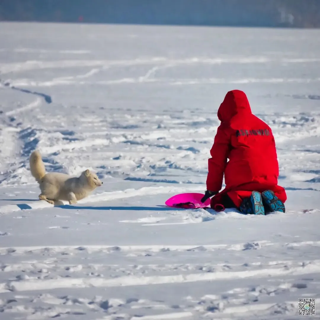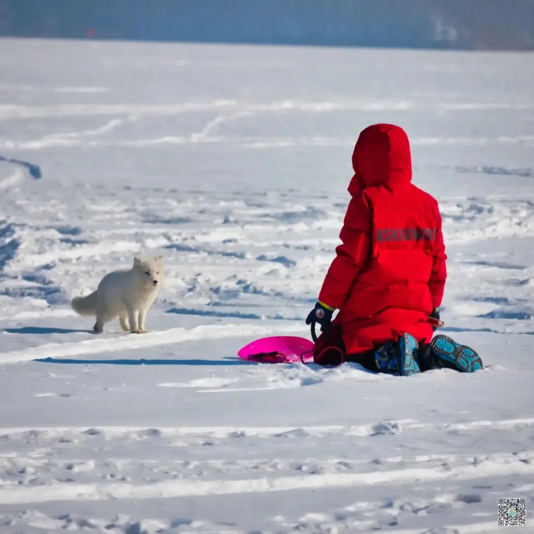 在这里我们还碰到了一只漂亮的小雪狐,小家伙还和雪狐嘻嘻玩儿耍了一会儿