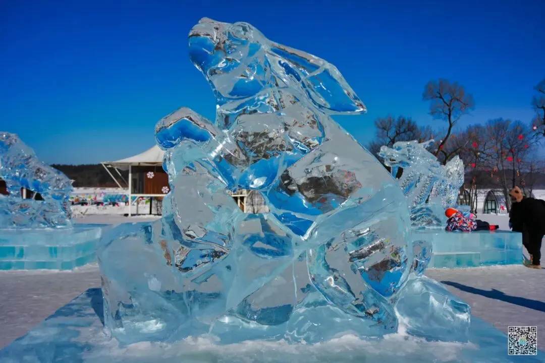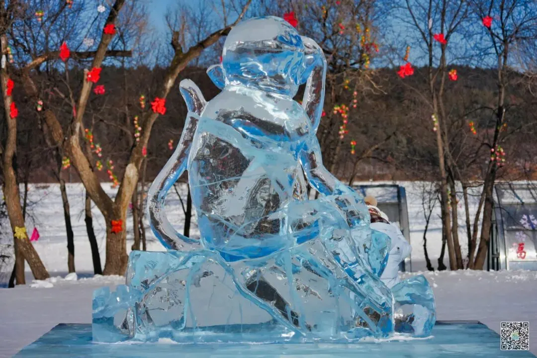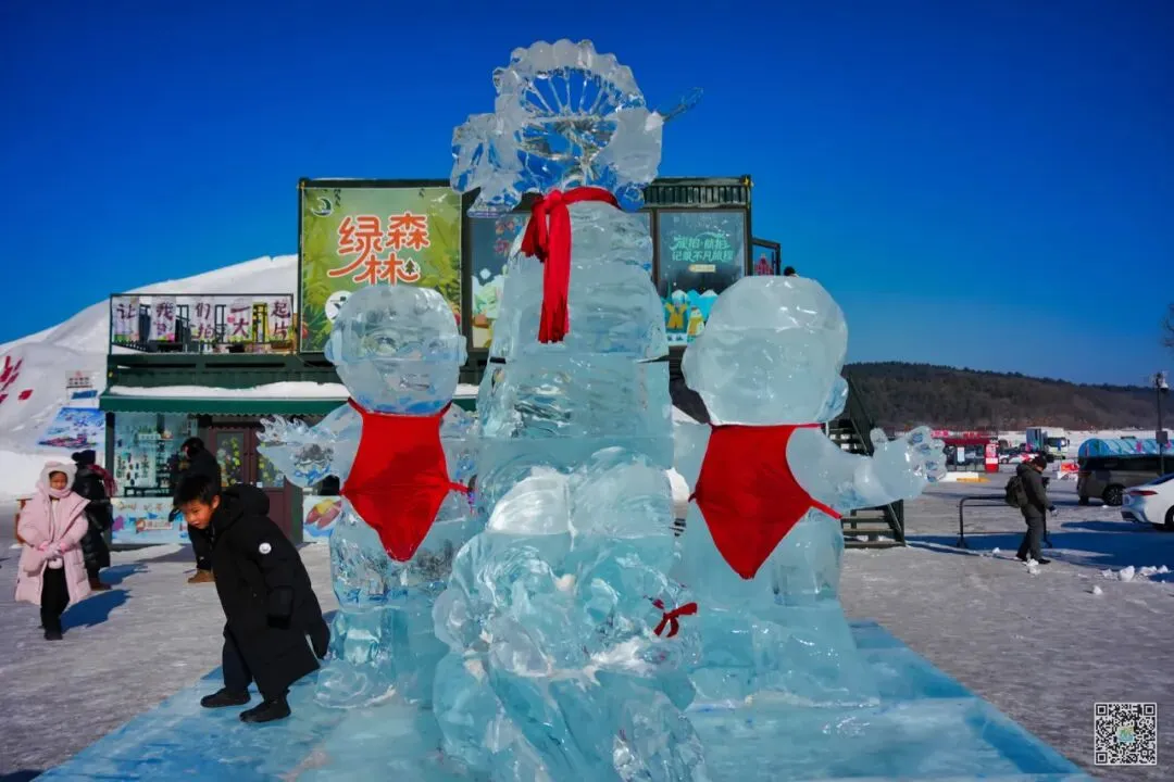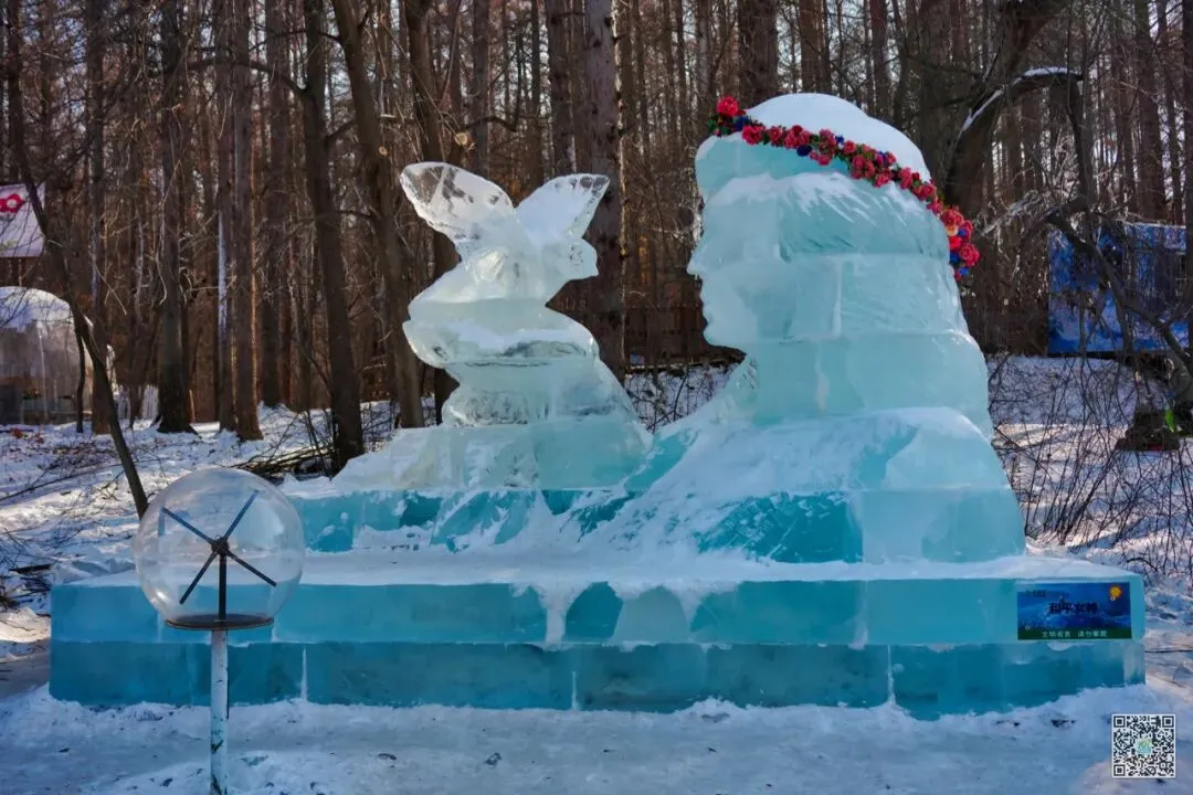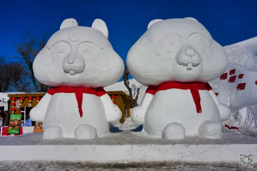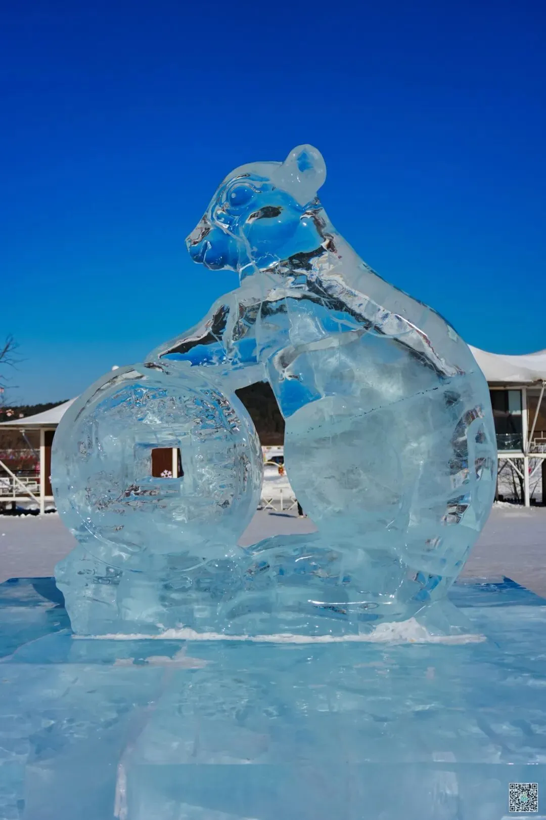 而后我们就来到了冰雪世界站,这是净月潭以森林精灵松鼠为原型创造的“净净”“月月”的IP形象的雪雕