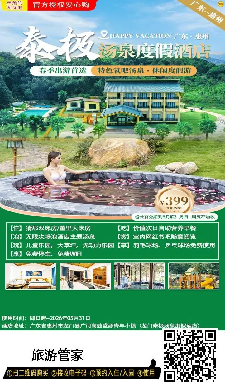 酒店地址:广东省惠州市龙门县广河高速盛源青年小镇(龙门泰极汤泉度假酒店)