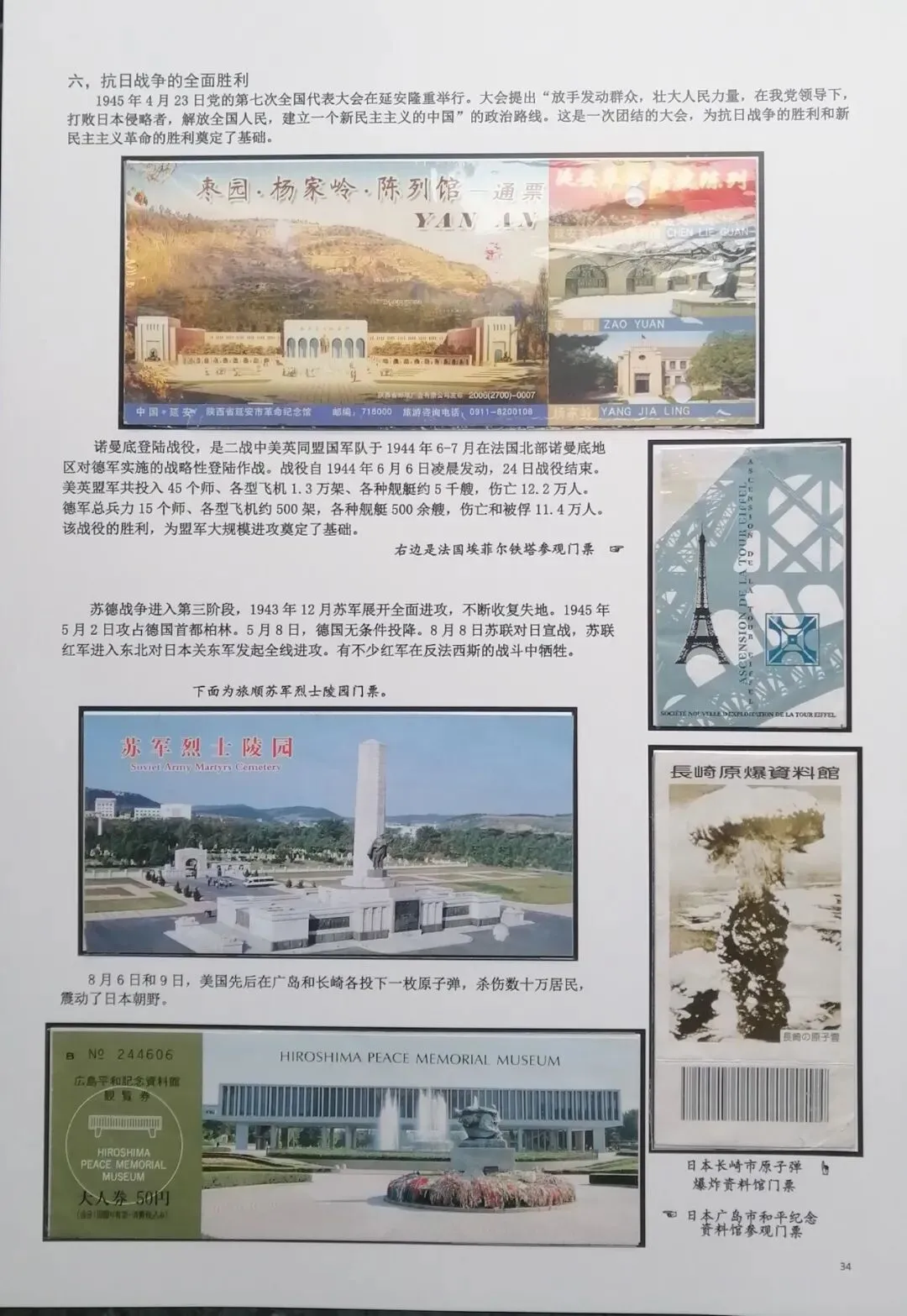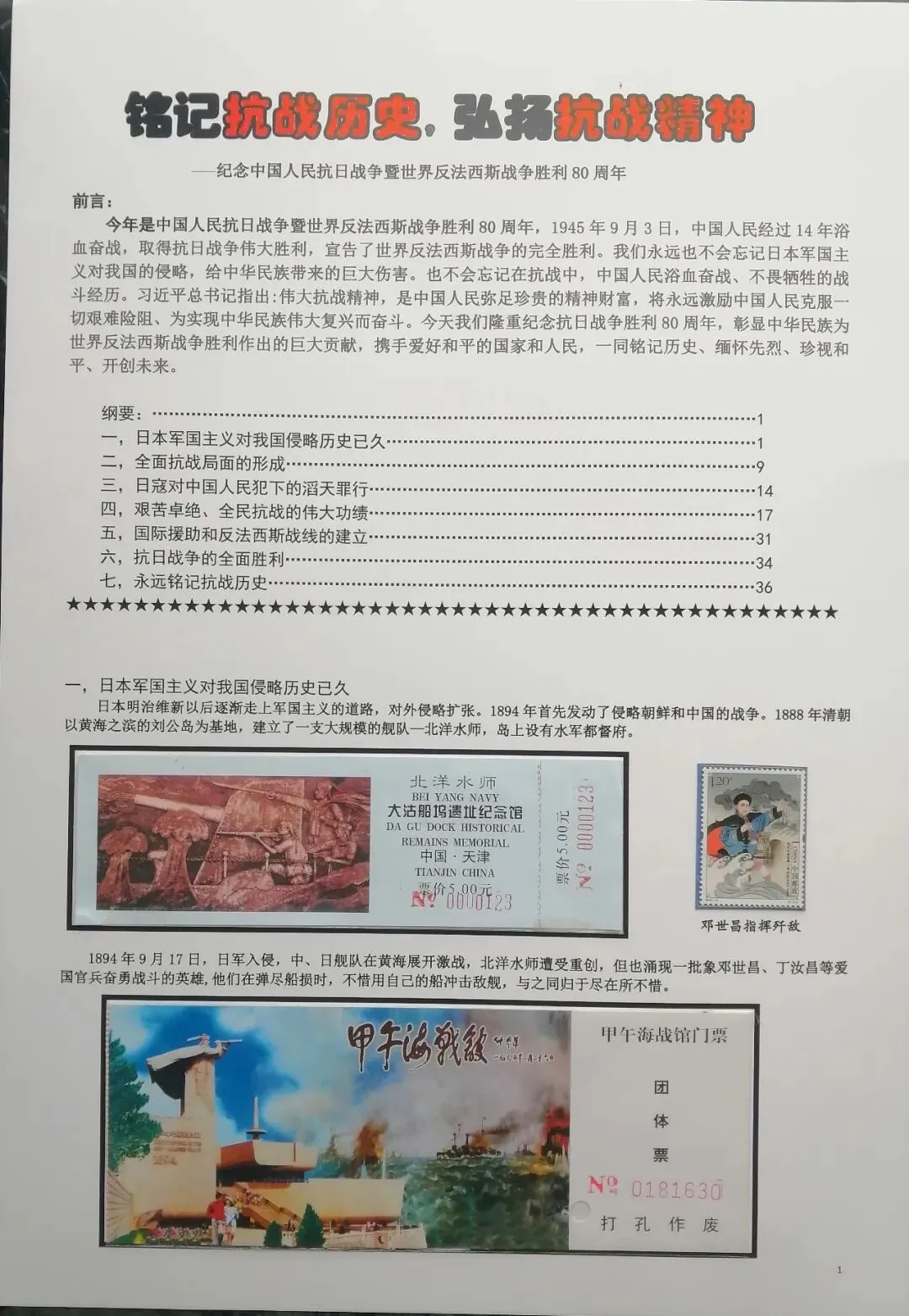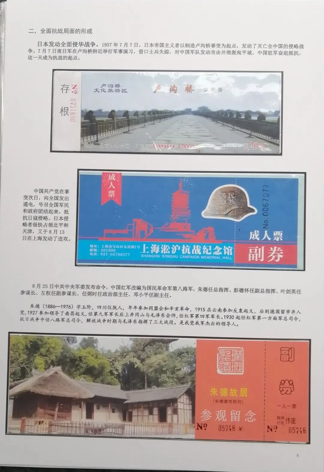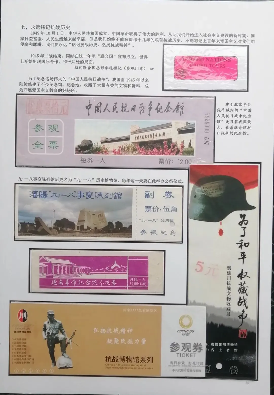 然后在电脑上重新编排,尽量做到把抗日战争的全过程中,主要发生的事件都能有体现。考虑到日本军国主义早在1894年就对我国进行了侵略,发动的甲午之战,导致北洋舰队全军覆没,因此我把集子的起点定在甲午海战。想到国共合作统一战线形成,国民政府在正面战场有淞沪抗战、台儿庄大战、衡阳保卫战、滇西抗战等重要战役,共产党领导的八路军、新四军有东北抗联的战斗、平型关大战、百团大战、敌后游击战等战役,这些都是值得讲述的。因此必须有对应的门票。同时中共中央、八路军、新四军的主要领导、将领也必须介绍。可惜国民党方面的抗日将领,有关的门票太少,造成部分故事只有文字,缺乏门票配合。为了补充一些资料的欠缺和排版中的一些空白处,我补充了少量的有关邮票,这样既补充了内容,又改善了排版,收到比较好的效果(乐山门票展规定,非门票纸质藏品不超过30%可以使用)。考虑到绝大多数门票收集难度都不大,也不算很珍罕,我又增加了少量外国门票,包括日本广岛和长崎的原子弹爆炸纪念馆,美国珍珠港事件纪念馆,苏联莫斯科克里姆林宫门票等,这些都对主题文字的说明起到很好的对应作用。在经过近一月的制作之后,完成了整个集子,由刘华帮助请印刷厂打印出底稿。制作完成后我把它发到协会编委群里,征求大家意见。在听取部分门票藏友关于文字偏多的意见,还有刘华关于“邓世昌纪念馆”门票可能是假票的意见后,我又全面进行了一次修改。同时对每枚门票位置打印了黑色边框,增加了版面的美观。又让印刷厂再次打印,我又把门票从集子上取下又制作了一遍,才算完成最终的成品。