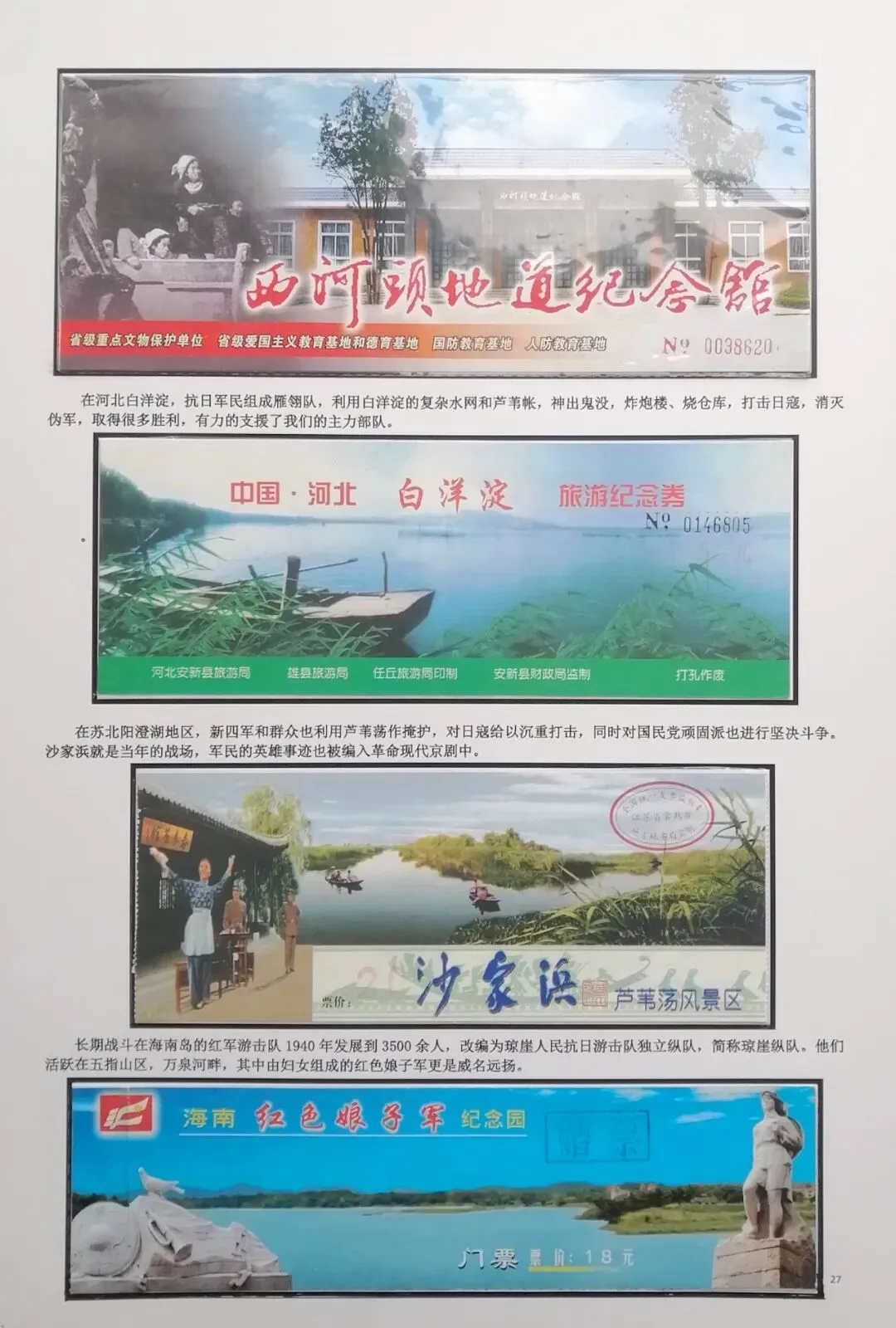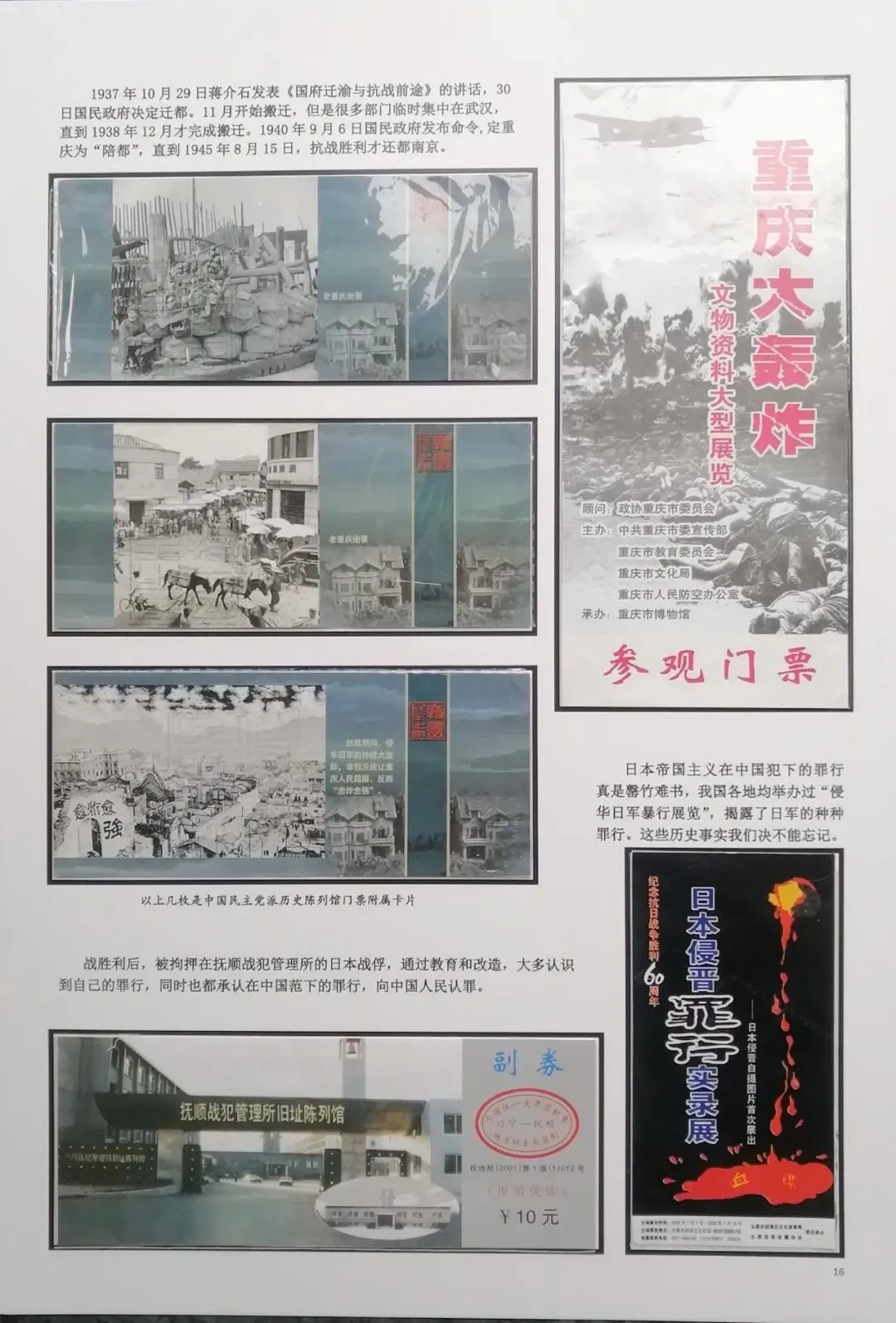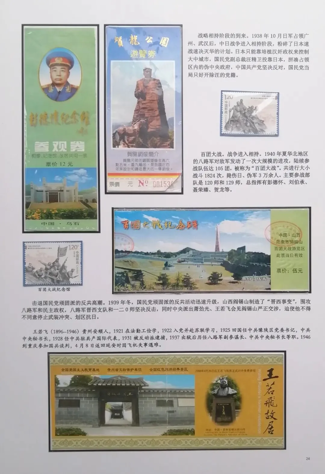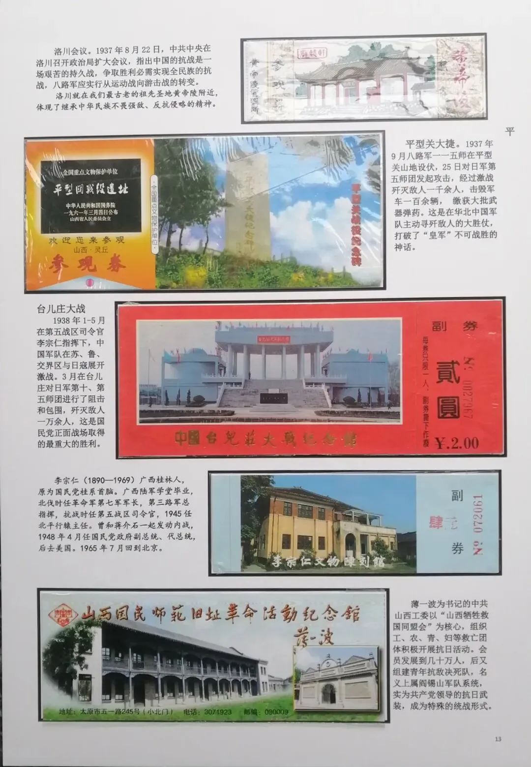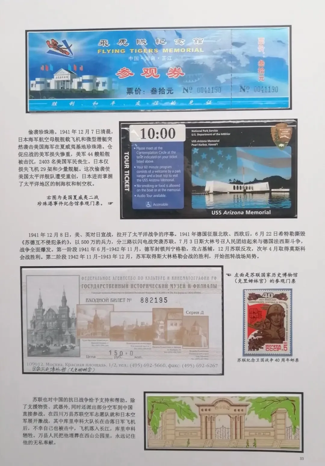 然后在电脑上重新编排,尽量做到把抗日战争的全过程中,主要发生的事件都能有体现。考虑到日本军国主义早在1894年就对我国进行了侵略,发动的甲午之战,导致北洋舰队全军覆没,因此我把集子的起点定在甲午海战。想到国共合作统一战线形成,国民政府在正面战场有淞沪抗战、台儿庄大战、衡阳保卫战、滇西抗战等重要战役,共产党领导的八路军、新四军有东北抗联的战斗、平型关大战、百团大战、敌后游击战等战役,这些都是值得讲述的。因此必须有对应的门票。同时中共中央、八路军、新四军的主要领导、将领也必须介绍。可惜国民党方面的抗日将领,有关的门票太少,造成部分故事只有文字,缺乏门票配合。为了补充一些资料的欠缺和排版中的一些空白处,我补充了少量的有关邮票,这样既补充了内容,又改善了排版,收到比较好的效果(乐山门票展规定,非门票纸质藏品不超过30%可以使用)。考虑到绝大多数门票收集难度都不大,也不算很珍罕,我又增加了少量外国门票,包括日本广岛和长崎的原子弹爆炸纪念馆,美国珍珠港事件纪念馆,苏联莫斯科克里姆林宫门票等,这些都对主题文字的说明起到很好的对应作用。在经过近一月的制作之后,完成了整个集子,由刘华帮助请印刷厂打印出底稿。制作完成后我把它发到协会编委群里,征求大家意见。在听取部分门票藏友关于文字偏多的意见,还有刘华关于“邓世昌纪念馆”门票可能是假票的意见后,我又全面进行了一次修改。同时对每枚门票位置打印了黑色边框,增加了版面的美观。又让印刷厂再次打印,我又把门票从集子上取下又制作了一遍,才算完成最终的成品。