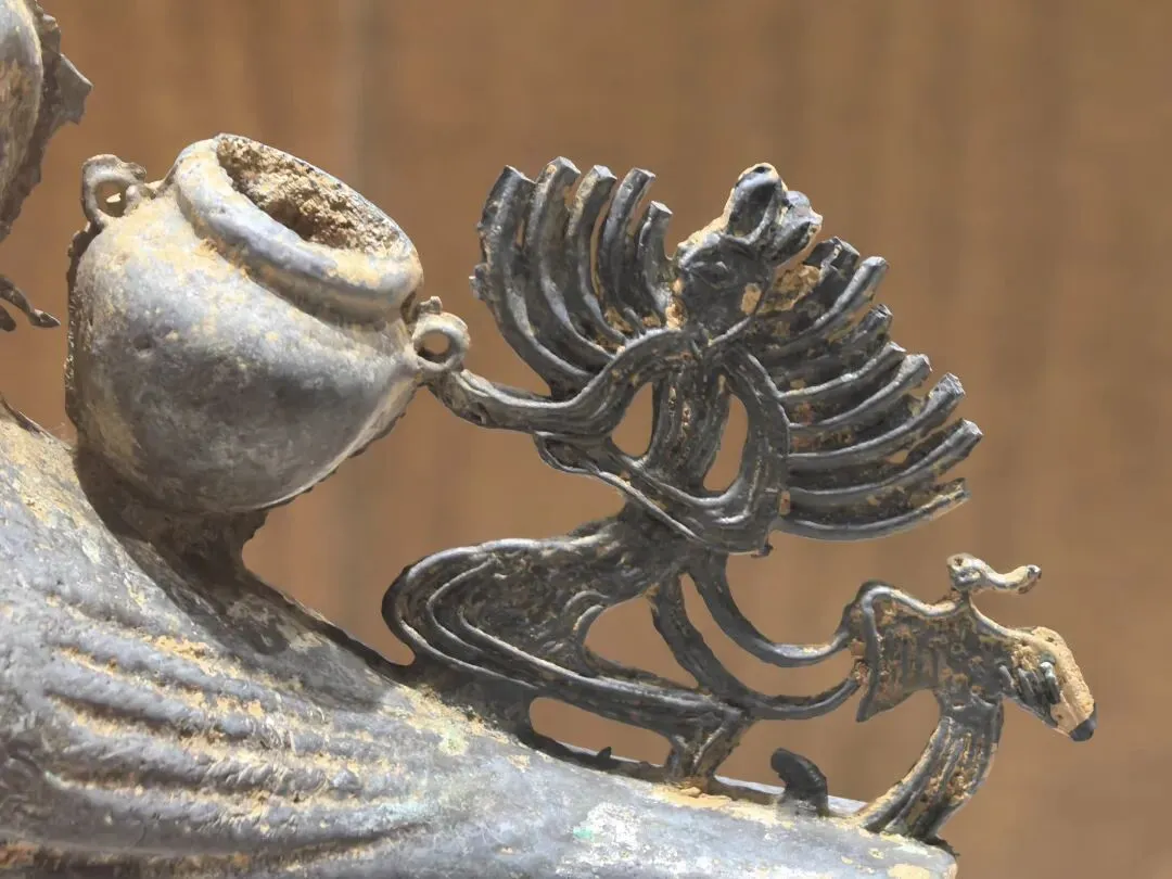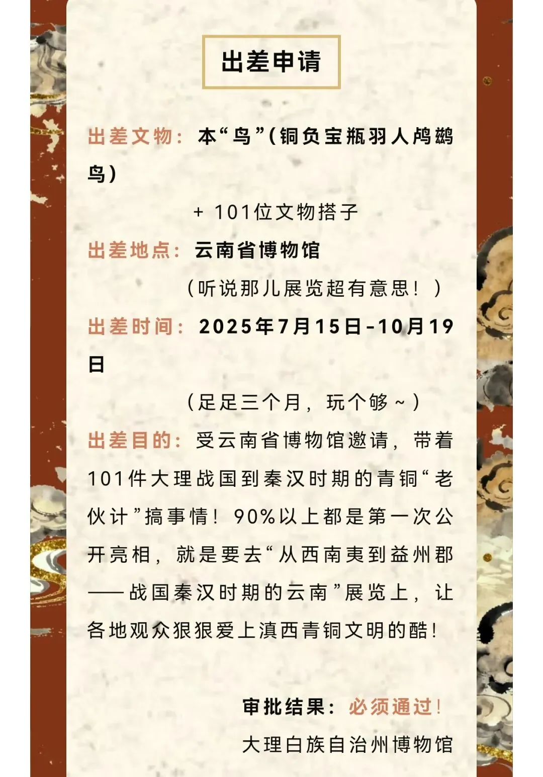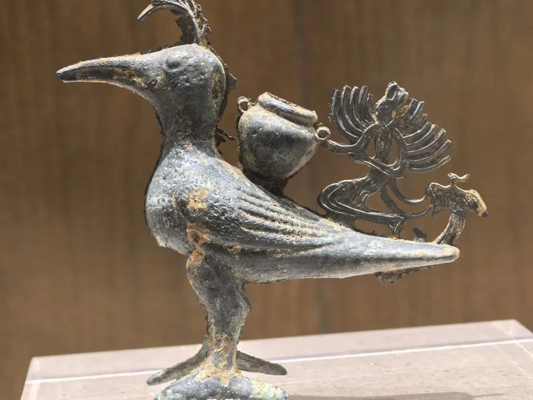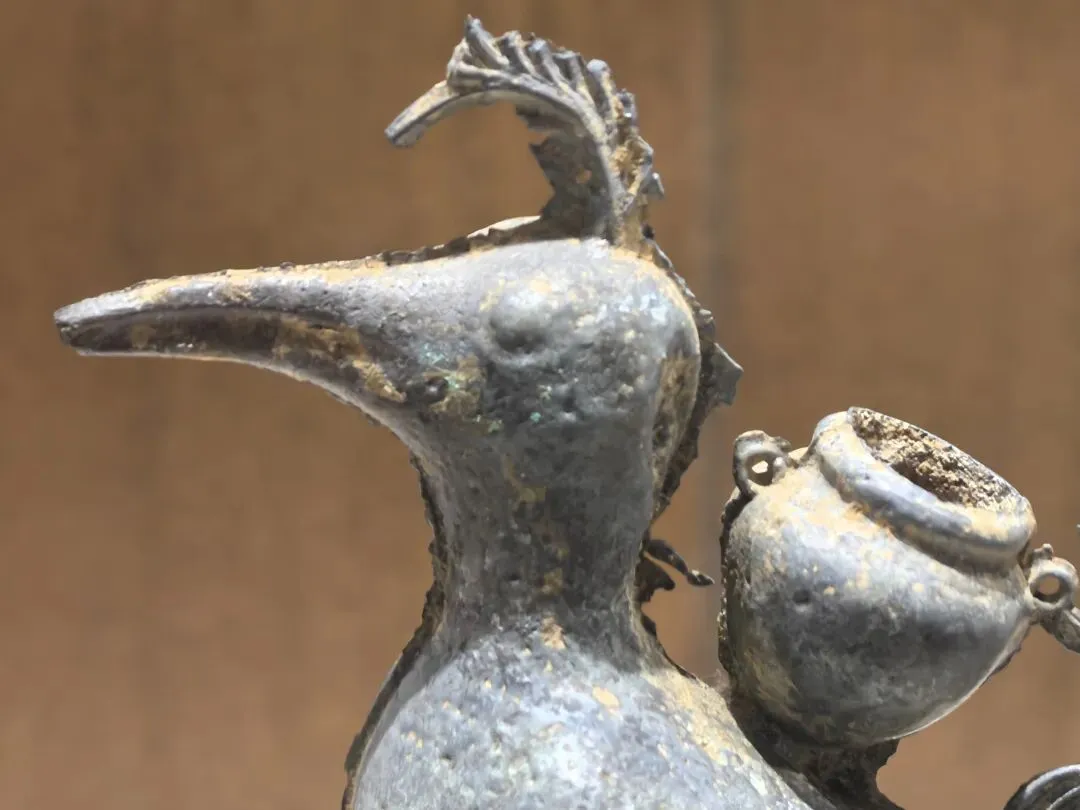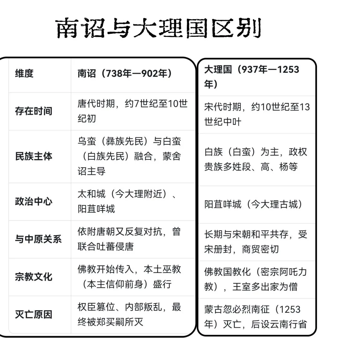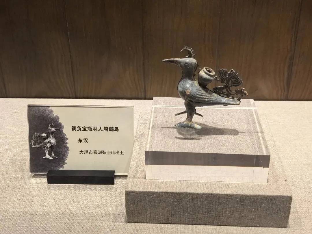 小添在上博东馆考古馆里看到过介绍不同年代的土层里的发掘文物,所以对这个已经有点感觉了。石器时代的工具,已经有点精致的感觉。手残党表示我根本做不出来。。。云南的铜牛造型很特别,牛角夸张地竖起,不知道是不是品种本就如此。 青铜质,长15.44厘米;高13.68厘米;宽3.3厘米。铜牛健壮雄健,前腿向前伸直,后足直立,呈行走状。牛头微微上扬,双耳上竖,目视前方。牛角粗壮,向上直立。颈部粗壮,牛背前部高耸,腹部肥硕,细尾下垂,体腔中空。中间留有合范线。铜牛形态剽悍,生动逼真。该马为冥器,是权利的一种象征。大理州祥云县红土坡出土,基本完好。(来自官方公众号)铜马气势上差点意思,估计是当时马在大山古道无法展现草原上的雄姿。大理市喜洲弘圭山东汉砖室墓出土。铜鸬鹚鸟为空心铜铸而成,器腹内留有很细的灰色铸沙,以腹底部为开口。整体呈立姿,昂首,圆目直视前方,嘴尖且长,衔有一尾小鱼。头顶后部留有扇状短冠羽,可惜大部分不存。鸟的脖颈粗壮且长,翅膀紧贴腹部,暗刻成羽翅状。尾翼纤细且短,向上翘起。鸟背负有一双耳宝瓶,宝瓶短颈、丰肩、平底。宝瓶后饰跪姿羽人,羽人猴面兔耳,双手肩膀上饰有条形羽翅,一手扶在宝瓶耳上,羽人后饰一凤鸟。(来自官方公众号)以上都是放大图,其实小小一只。据说鸬鹚鸟经常出差,我们幸运遇到。据官方消息,2026年7月15日起,鸬鹚鸟将带领一众文物去云南博物馆“出差”。大理州博物馆里有介绍南诏、大理国历史沿革和大事年表,奈何我木鱼脑袋记不住。干脆让deepsee做了一个简单表格:南诏建立后,和唐王朝之间爆发过天宝战争。大唐帝国元气大伤,后引发安史之乱,从此由盛转衰。 (唐)杜甫