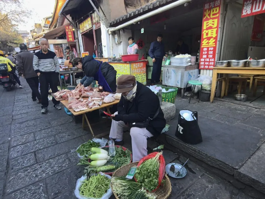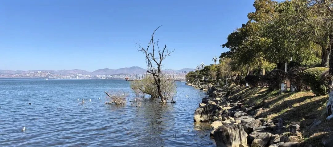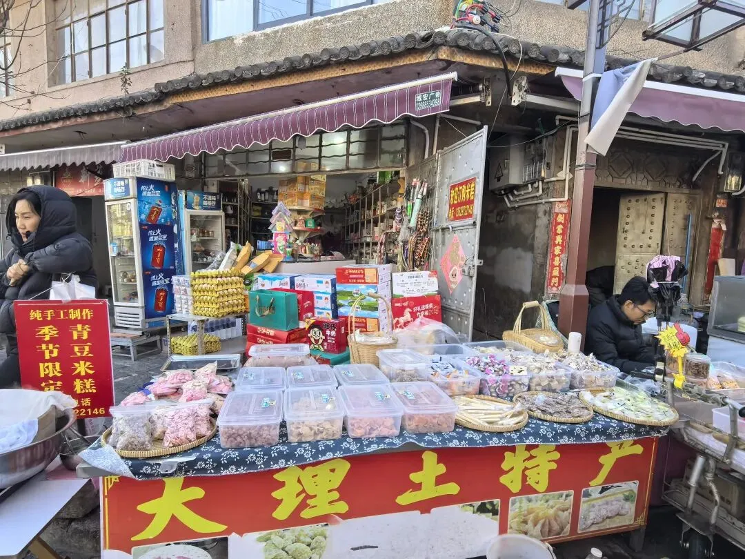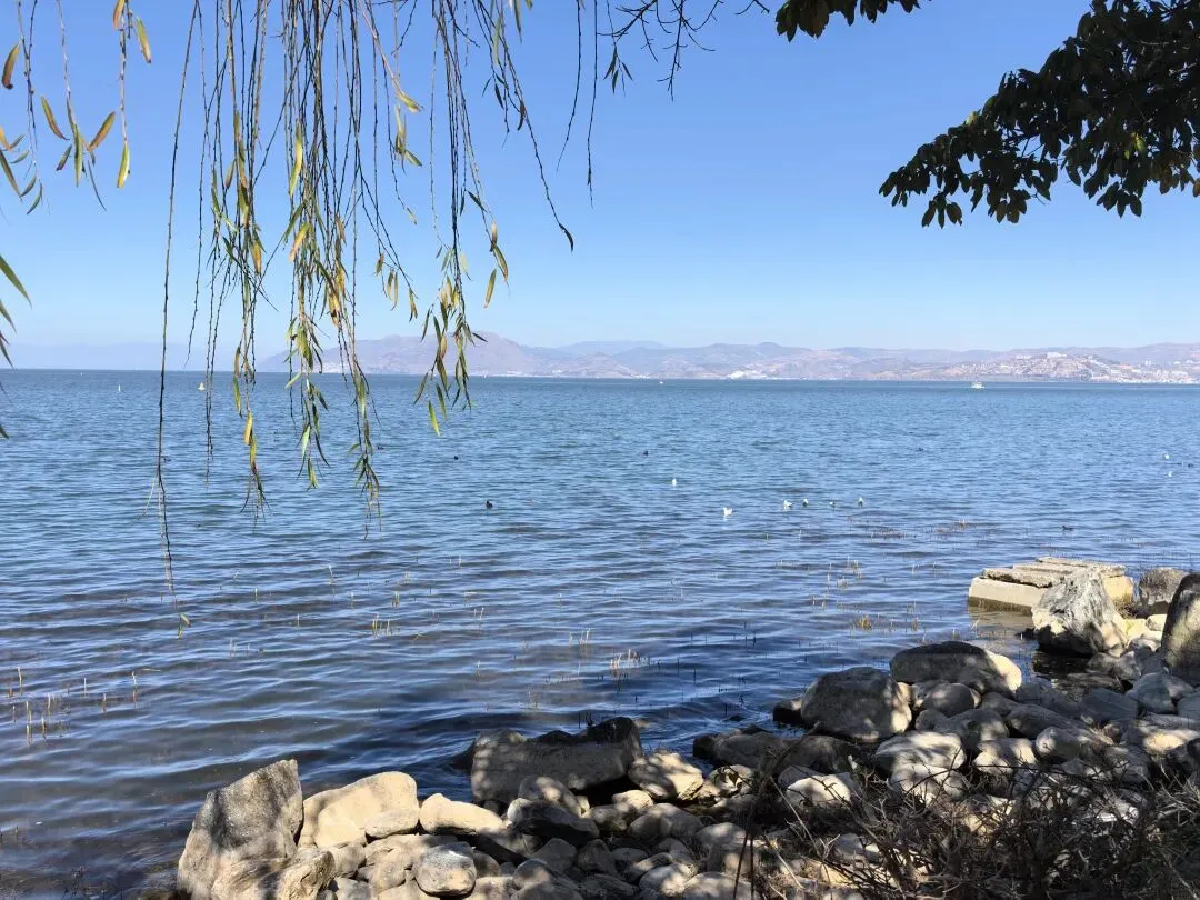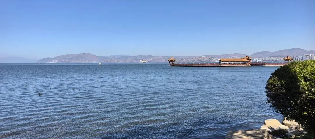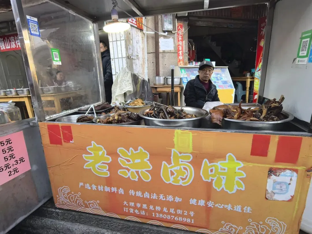 右边这种水果是第一次看到,感觉非常漂亮,好奇的买了一点,洗完后尝尝特别像蜜饯的味道,我个人不喜欢,队友却说好吃。不过我们最后买了两盒蓝莓,因为摊主让我们先尝了几颗,太惊艳了。我在上海经常买蓝莓,但是从来不知道真正的新鲜蓝莓居然口感可以这么好。先不说味道如此之好,价格还这么便宜,十元两小盒,真是特别羡慕云南的朋友们。走到洱海公园附近的时候,先去一旁的便利店买了一大袋白面包,想着等会儿喂海鸥。“百二山河”典出《史记·高祖本纪》,原喻“山河险固,二万兵可敌百万”,是历代形容天险之地的经典说法。明嘉靖年间,四川状元杨慎(升庵)因贬谪途经大理,见苍山为屏、洱海为带,上关龙首、下关龙尾两关扼守要道,地势险要堪比“百二秦关”,遂挥笔题写此四字,原匾嵌于下关玉龙关城楼,成为大理的地理名片。(杨慎这个名字可能不那么知名,但是他的《临江仙·滚滚长江东逝水》作为《三国演义》开篇,却随着同名电视剧的播放而广为传诵。)来自西伯利亚的红嘴鸥们,更给这片蓝色增加了灵动和浪漫。来到这里之后真的啥也不想干,只想在洱海边坐着发呆。(当然不可能,因为娃每天心心念念要喂海鸥)然而突然看到这个通告牌。额,有点意外,也有点失望。(虽然一路上还是有小商贩在兜售鸥粮)不过既然有了官方规定,是为了保护水源,我们只能遵守。反过来想,如果不喂鸥的话,就只能一心一意专心看风景,其实也不失为一种享受和收获。我们特意不去龙龛码头或者网红S弯这些地方,而是来到洱海公园,确实选对了,这里游客很少,非常安静。偶然碰到的一些,要么在和我们一样散步,要么坐在长椅上安静拍视频。把双肩包上挂着的胡迪取下来,让他代替我在围栏上坐了一会 。小添不能喂海鸥,有点百无聊赖,开始爬栏杆往前。女汉子的本性暴露无疑。终于走到“水上人家”饭店对面。我已经在地图上做好标记,但是大众点评上有点褒贬不一。正好有几位游客刚从里面出来。我问他们这家口味如何,他们说很好吃,而且很便宜,于是我们走进去,也上了4楼。下午两点半,早已过了饭点,我们得以坐到靠窗的绝佳位置。小添不能吃辣,给她点了片皮鸭,但是原材料是云南本地小麻鸭。这盘“白族杀猪菜”超大一盆,但是不太对口味,主要是被名字吸引了。(联想到前不久网友们奔赴呆呆家去杀猪的新闻,哈哈哈)来云南不能不吃米线。这是最便宜的一种,39元。摆盘简直像艺术品:以为这就完了?米线还送一大碗玫瑰小圆子。扶墙走也吃不完。这一餐得再来2-3人才能不浪费。小添如愿以偿,和爸爸一起喂了红嘴鸥。我负责拍照记录。下午五点,洱海边的风呼呼呼吹的遍体生寒。但是太阳还高,离天黑还有2~3小时,队友提议我们去龙尾关,说这里有历史感。于是我们打车去龙尾关。红袋子里面是新鲜折耳根,大宝喜欢的螺蛳粉里有这个配料,我受不了。。。沿着斜坡路爬高,两边是林立的各种店铺