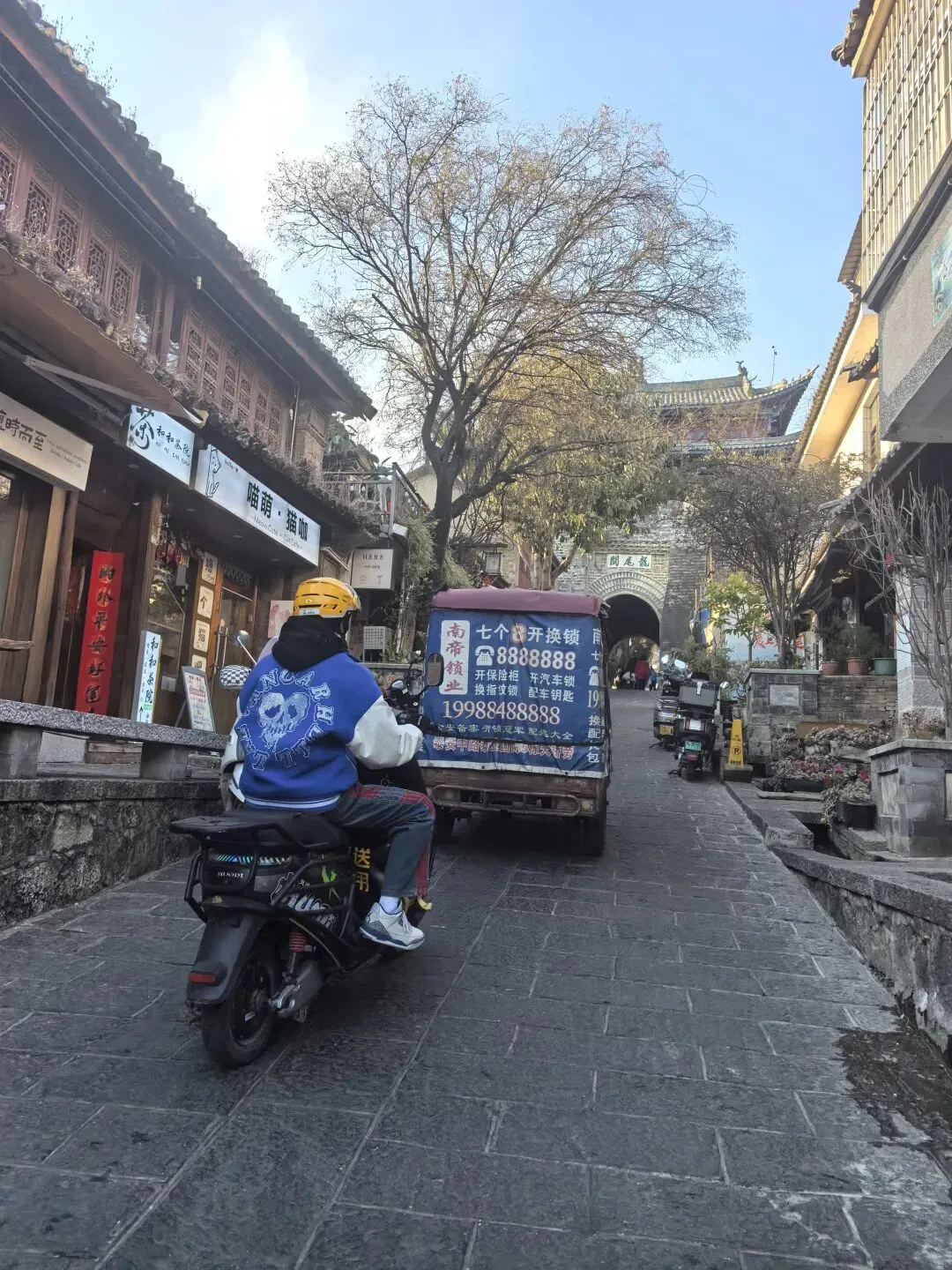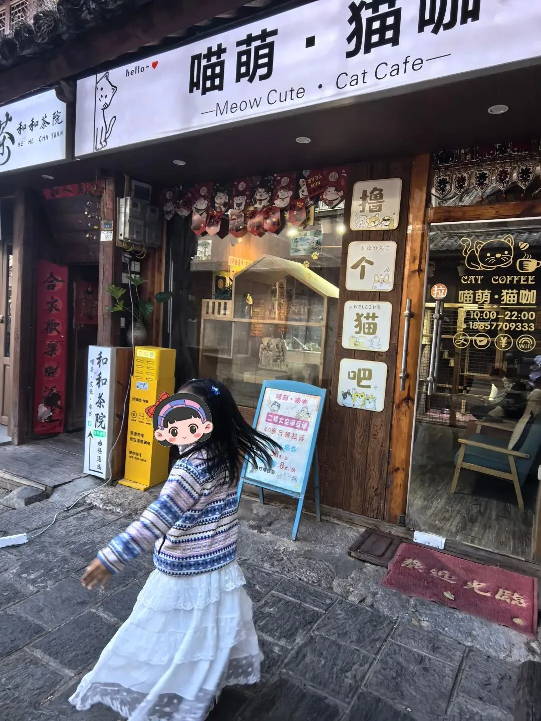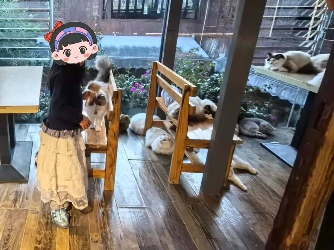一直有电瓶车和小三轮在路上行驶,所以走路还是要靠边更安全。龙尾关大门。网上查到1200年前,这里曾经是南诏都城的南大门。天宝战争就发生在这里。脑海里突然浮现辛弃疾的名句,虽然这里不是长江也非北固楼。何处望神州?满眼风光北固楼。千古兴亡多少事?悠悠。不尽长江滚滚流。我这边还在搜肠刮肚,回忆以前看过的古诗文。小添一句话把我拉回现实,避免了我在胡思乱想悲春伤秋中沉溺过久:家里空间小,我也没精力,不能养猫,一直是小添的一个心结。所以刚刚路过一家猫咖,就和她约好,等一下回来的时候带她进去玩儿。差不多十几二十只,都有名字。其他游客陆续散了,就剩我们。玩到7点,小添恋恋不舍地出来(其实是因为猫粮喂完了,大部分的猫营业一天已经开始睡觉)前面午饭吃完已经下午三点多,七点多完全没有胃口再去觅食,所以直接打车回到酒店。回到酒店时,窗外已渐渐暮色降临。小添趴在桌子上,在行程本上画了今天的蓝莓和叫“圆圆”的那只小猫,嘴里还念叨着“今天虽然一开始没喂到海鸥,但吃到了最好吃的蓝莓,还买到漂亮的冰箱贴,还和那么多小猫玩,太开心了”。
