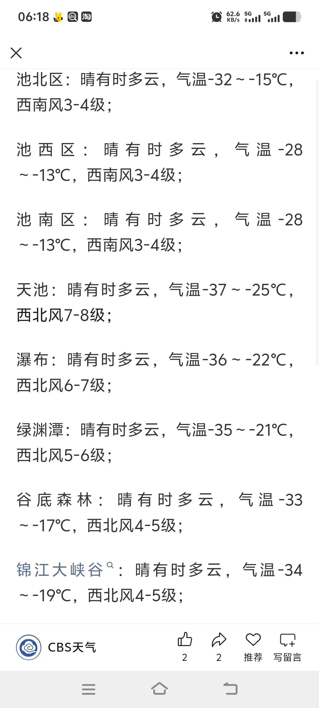 ➡️北景区天池主峰,风力较大,公路、栈道积雪结冰,不具备安全运营条件,天池景点全天关闭。其他景点正常开放,视天气情况随时关闭。 ➡️西景区主峰,风力较大,公路积雪结冰,不具备安全运营条件,天池景点全天关闭。粉雪谷、锦江大峡谷景点,正常开放,视天气情况随时关闭。 ➡️南景区关闭。
