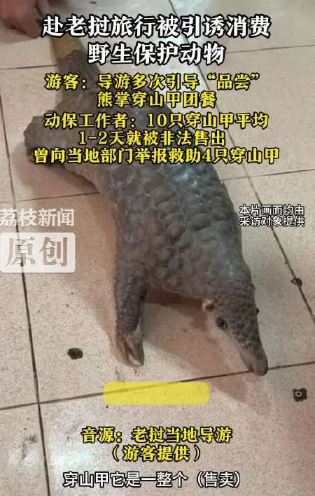 #赴老挝旅游被诱导吃熊掌穿山甲##跟团游老挝被诱导买8000元犀牛角#】1月26日,老挝,游客小哲(化名)向@荔枝新闻 反映,2025年11月他从广东揭阳出发,参加一包括机票、导游服务费、住宿等约2300元的8天赴老挝旅行团,期间导游多次诱导游客前往特定餐厅吃穿山甲、熊掌团餐,参团游客中以老年人居多。“我那天亲眼看着餐馆的老板去杀穿山甲,拿了一个铁棒狠狠敲它的头,太残忍了。如果不吃的话,要自己外面找吃的,但是那些老人几乎语言是不通的,他们也不知道在外面怎么买东西。”据小哲介绍,行程后半段导游会频繁带游客前往购物中心,引导购买犀牛角、象牙等野生动物制品,真假难辨,且谎称相关制品在当地合法售卖,同团一位叔叔被诱导购买8000元所谓犀牛角后得到的仅有一张普通咖啡店收据。长期从事野生动物保护工作的黄泓翔告诉荔枝新闻,过去两年里他和团队持续关注着老挝野生动物非法贸易活动,今年一月中旬接到线索后前往老挝万象市一野生动物交易黑市蹲点,向当地执法部门举报后,从两名商贩手中缴获4只穿山甲,在当地救助站协助救护下,4只穿山甲均被放归自然保育区。黄泓翔在当地了解到,野生动物交易黑市上一只穿山甲初始售价折合人民币约1至2千元。导游向小哲等游客推销“团餐”时,售价以重量计算,每公斤售价即达人民币1千元,所售穿山甲体重在3-4公斤不等,且每只收取加工费600元。日前,黄泓翔团队已在当地发起保护野生动物宣传工作,不少当地华人加入其中。据了解,穿山甲属于全球性濒危野生动物,受《濒危野生动植物种国际贸易公约》保护,老挝是该公约的缔约国之一。