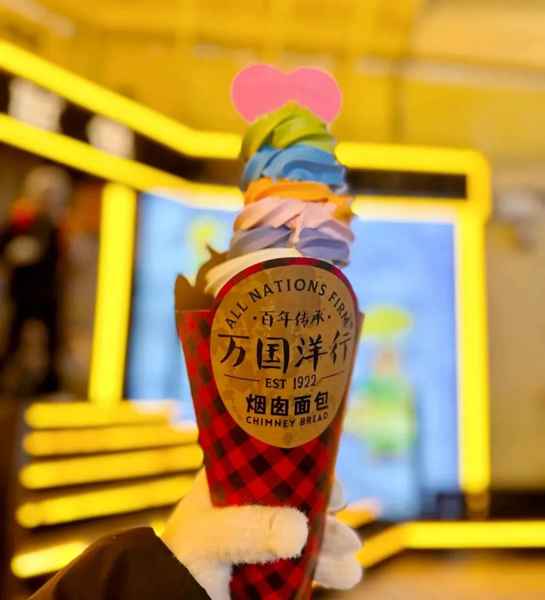 哈尔滨中央大街的万国洋行是烟囱面包的主要售卖点,顾客可以购买单面包或加冰淇淋的套餐。