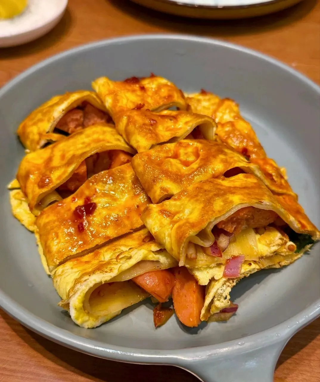 05 烤冷面 以特制的薄软冷面饼为主料,经铁板煎烤后搭配鸡蛋、香肠等辅料,刷上酱料,形成酸甜咸香的风味。