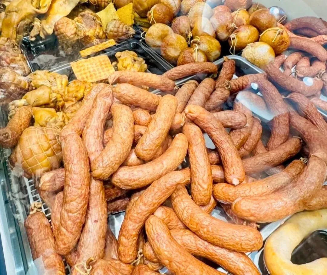 哈尔滨红肠原产俄罗斯立陶宛,1913年由哈肉联引入中国,因肠体枣红色得名,主料为猪肉(肥瘦比3:7)、淀粉、大蒜及香料,经25道工序制成。果木熏烤12小时以上,形成独特烟熏香与蒜香平衡,咸淡适中。肠衣脆韧,肉质紧实弹牙,肥肉丁如琥珀嵌于瘦肉中,嚼劲足。