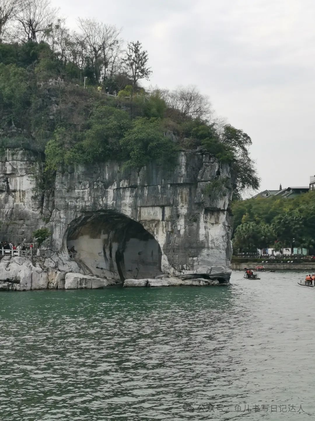 船开后乘客可以上到船的顶部观景、拍照。清澈的漓江水缓缓流动,旁边的象鼻山、叠彩峰……逐一出现,山水相连,密不可分。让人陶醉其中。