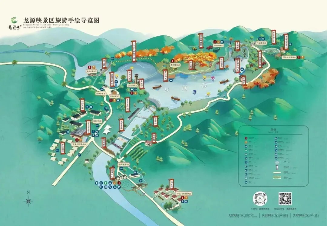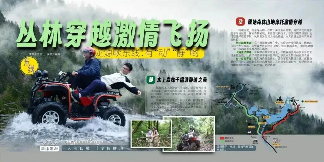 依据旅游功能和区块位置的不同,景区游玩项目分为“摩托森林穿越”“相约山盟海誓”“欢愉游山戏水”“住仙居享仙厨”等四个主题版块。同时,醉美龙源仙境体验适宜不同季节,春赏桐花烟雨、夏纳湖面凉风、秋观层林尽染、冬览玉树银花。为满足不同游玩需求,景区推出东西两条闭环游线。