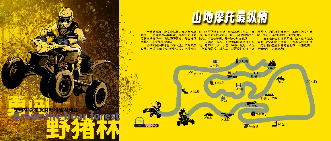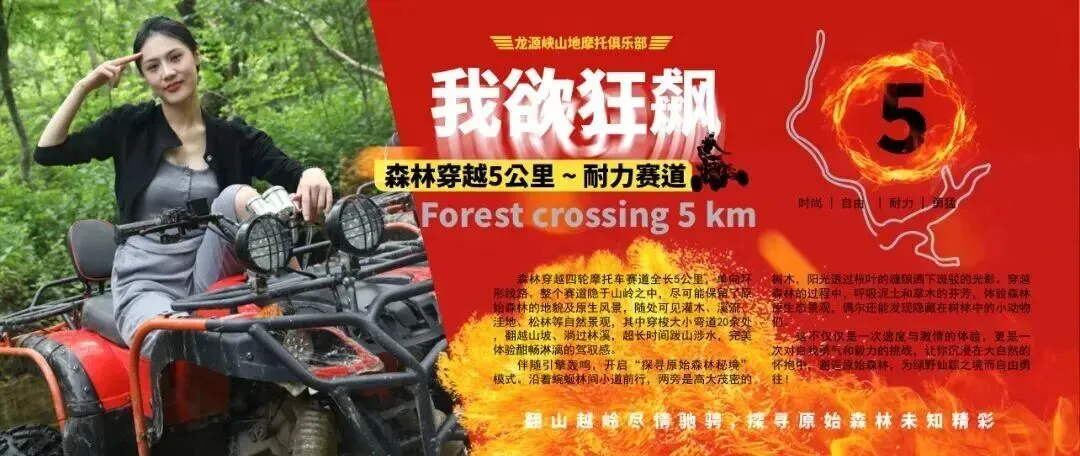 整个赛道隐于森林之中,驾驶四轮山地摩托跋山涉水,完美感受酣畅淋漓的驾驭感,翻山越岭探寻原始森林未知精彩。