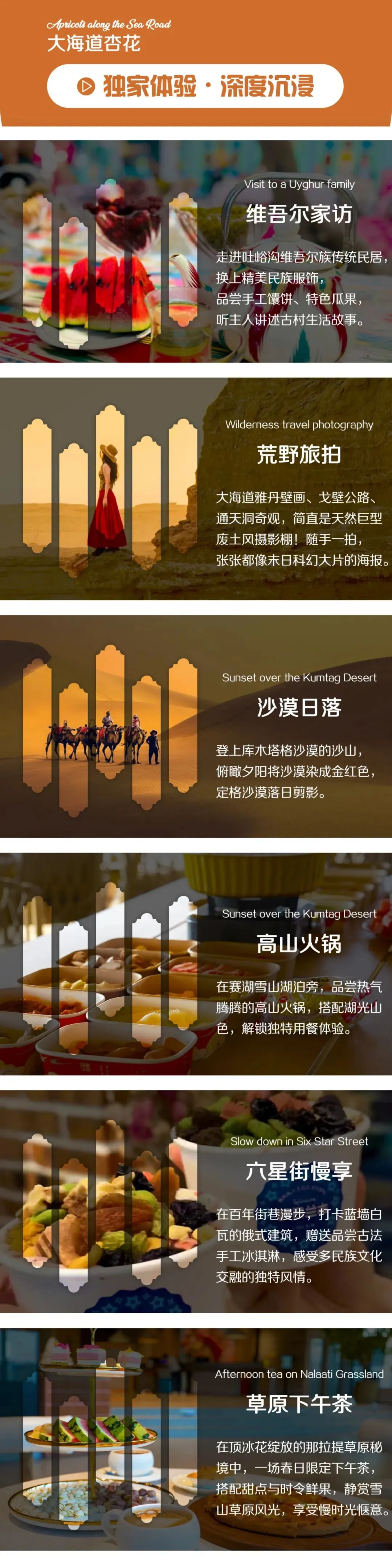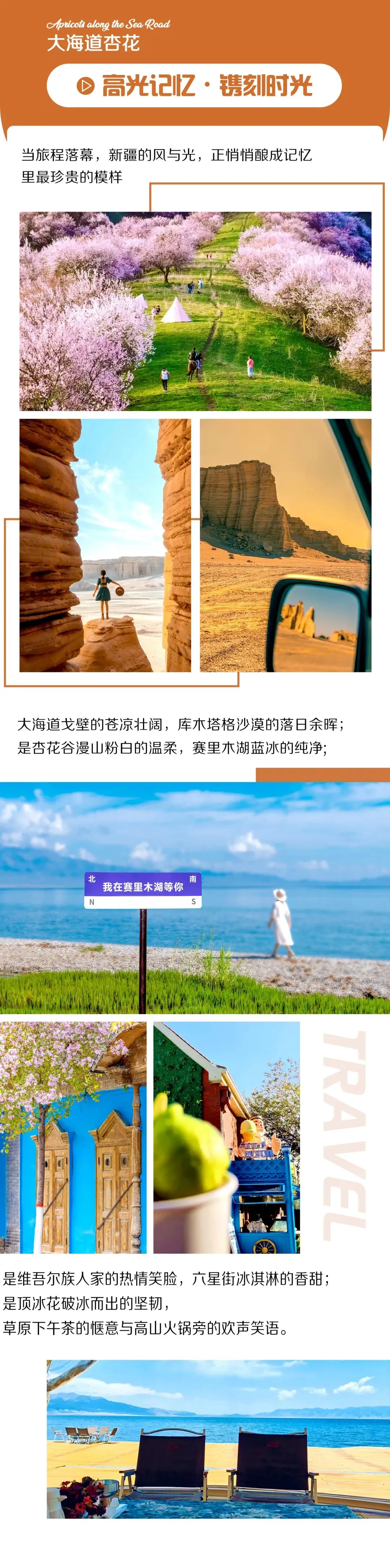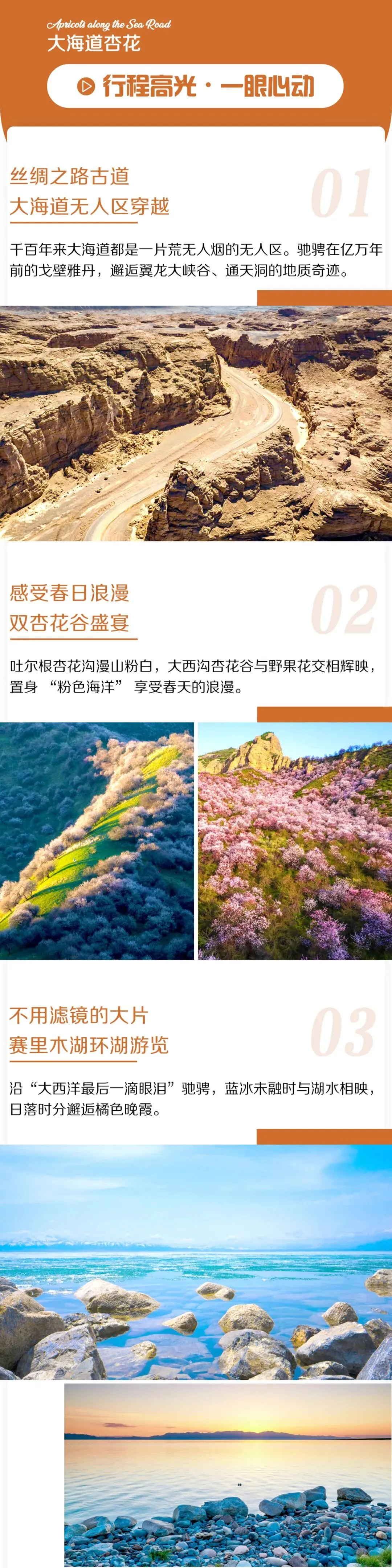 3. 全程景区门票+区间车:大海道门票+车票、库木塔格沙漠门票+小火车、那拉提草原门票+空中草原区间车、吐尔根杏花沟门票+区间车、大西沟杏花谷门票+区间车、赛里木湖门票+区间车;
