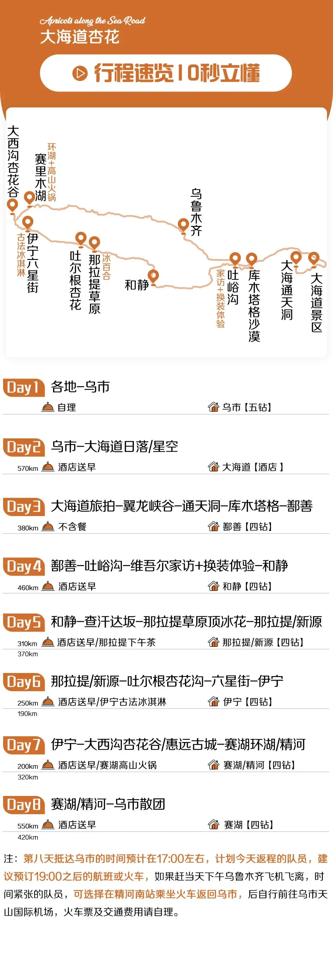 2.抵达乌市的时间预计在17:00左右,计划今天返程的队员,建议预订19:00之后的航班或火车,以免耽误返程;如果赶当天下午乌鲁木齐飞机飞离,时间上比较紧张的队员,可以选择在精河南站乘坐火车返回乌市,后前往乌市天山国际机场,火车票及交通费用请自理。