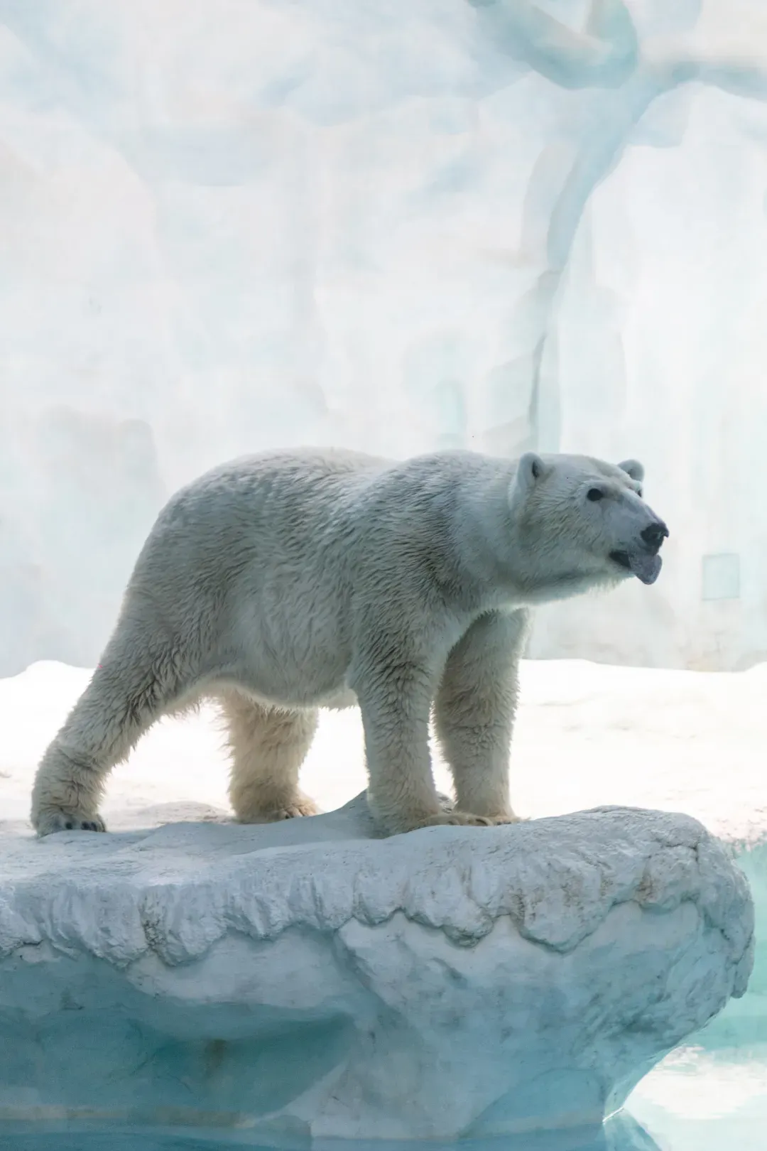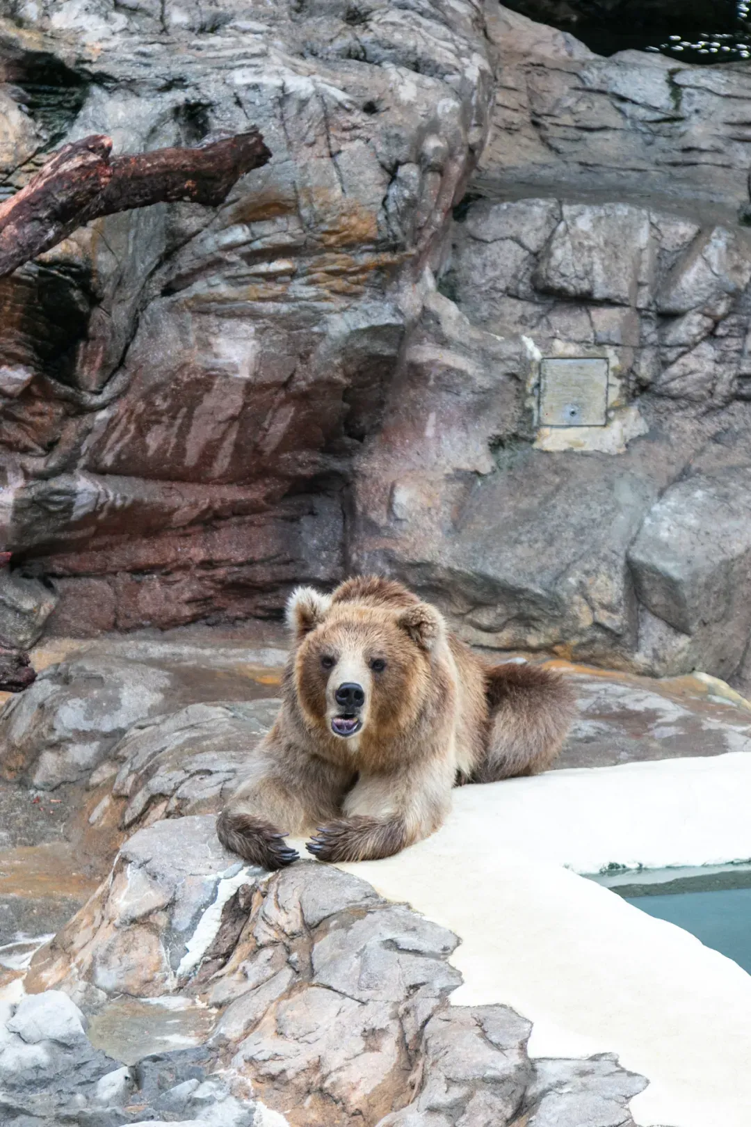 了解完南极,就该轮到北极了!来到这座冰山造型的北极熊馆前,首先看见的是傻fufu踱步的棕熊,原来棕熊是不怕晒的!