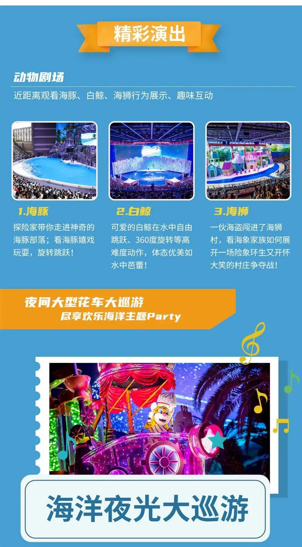 ★游:全面整合珍稀的海洋动物、全球最大的海洋动物主题公园;八大主题区域、三场精彩刺激的表演、大型花车巡游、机动游戏绝对不能错过!
