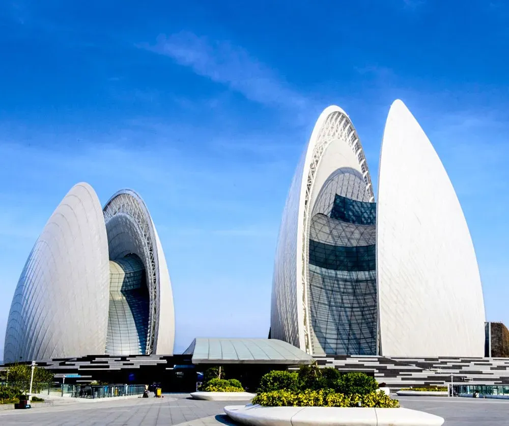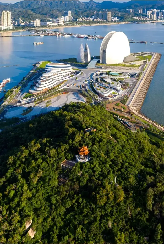 融。力求道路线型及与其配套的景观设施与起伏的山 峦、宽阔的海滩、一望无际的大海在气势上相呼应。中国唯一建设在海岛上的歌剧院【珠海大剧院】,其设计如一把珠海竖琴,珠海大剧院是一大一小两组"贝壳"的形体 又