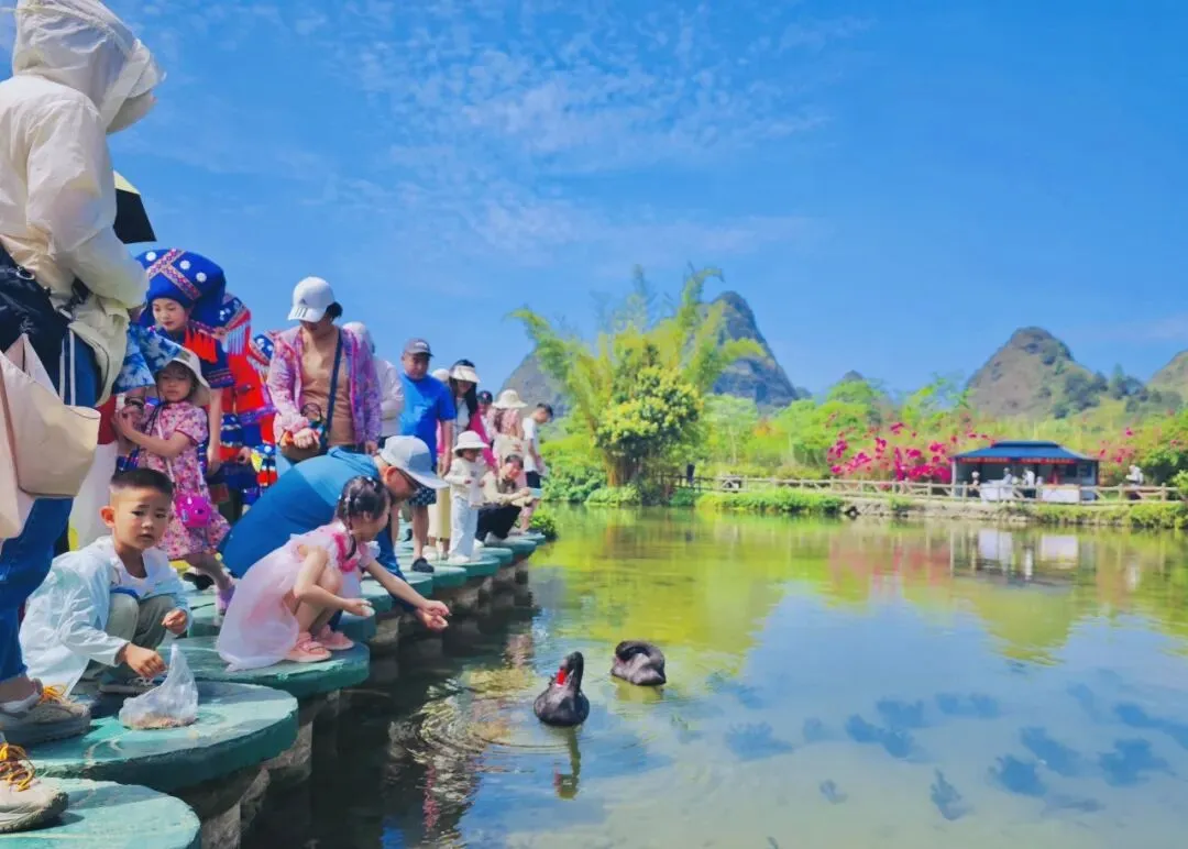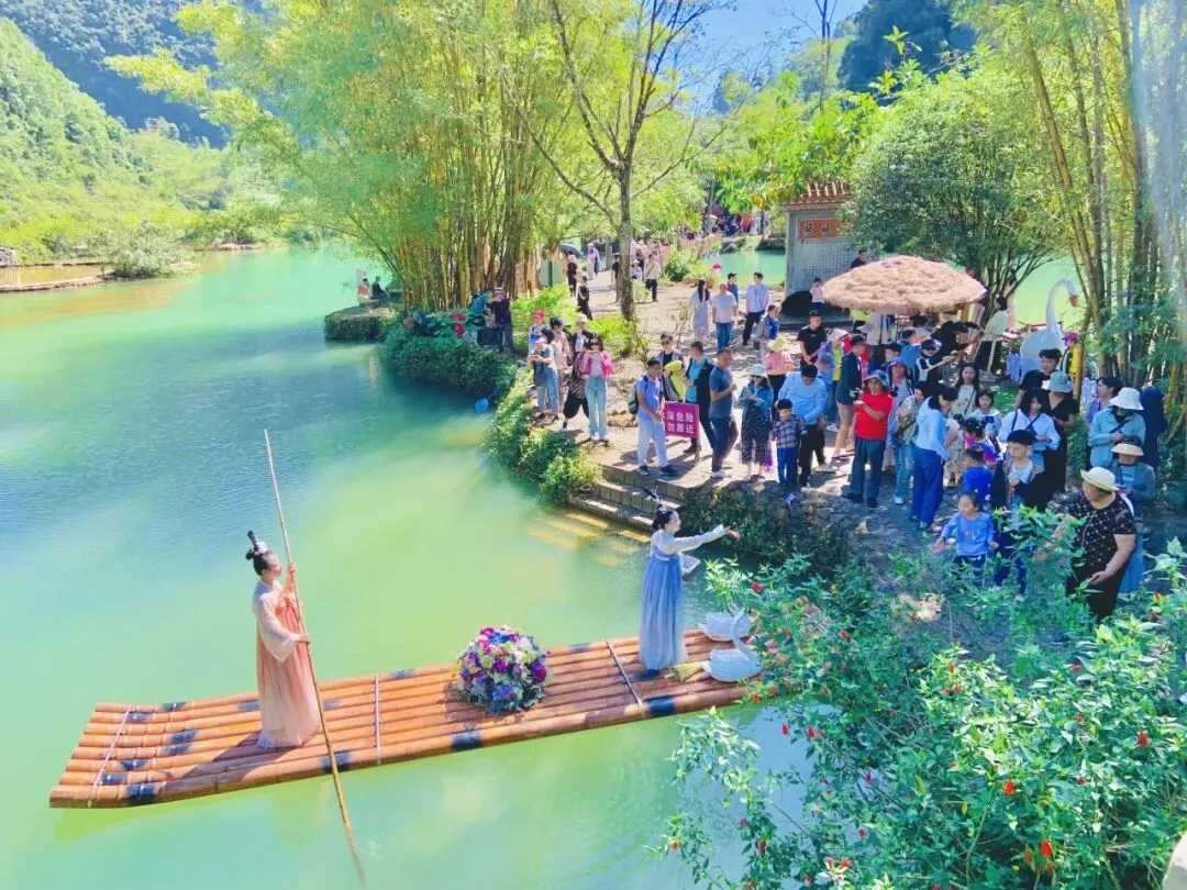 还结合鹅泉“鹅仙报恩”这一美丽传说,推出“鹅仙花船巡游”实景演艺项目,当鹅泉传说遇见碧波清泉,花船缓缓划开的不仅是涟漪,更是壮族孝道文化穿越时光的深情回响。