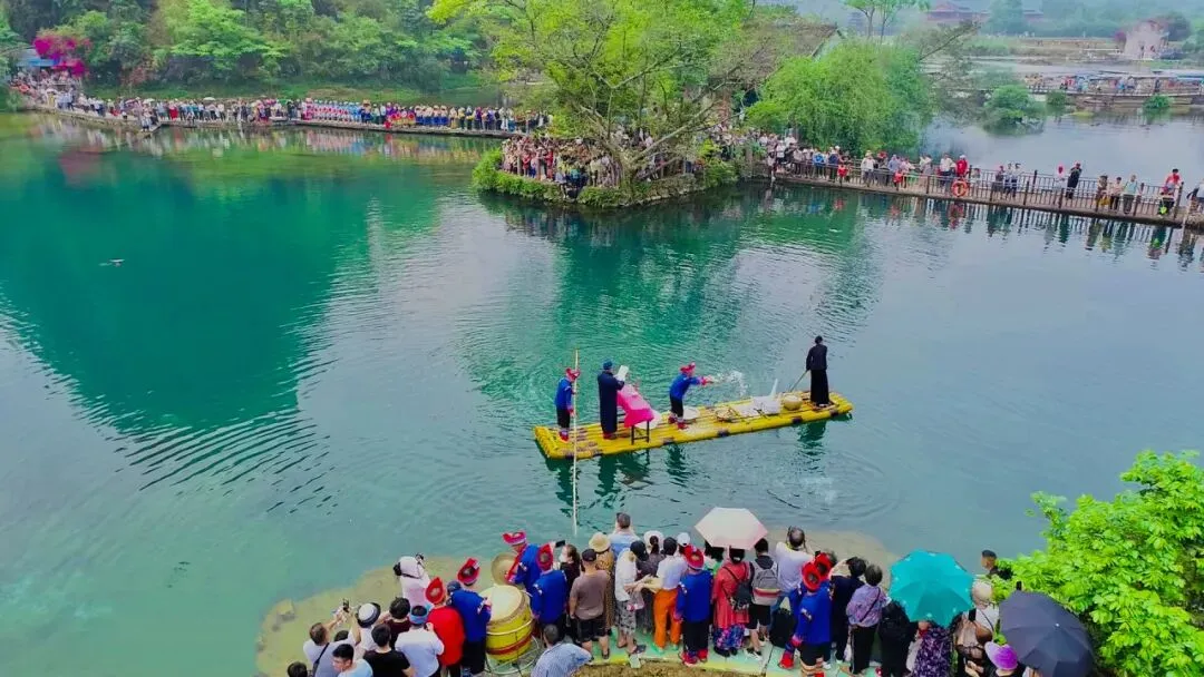 每年三月三,周边村寨的村民都会来到泉边祭祀以祈求风调雨顺,五谷丰登。村民们划着竹筏,将糯米撒入泉中,群鱼争食,加上铜鼓喧天,鱼儿纷纷跳出水面,场面蔚为壮观,闻名天下的“鹅泉跃鲤三层浪”奇观因此而得名。